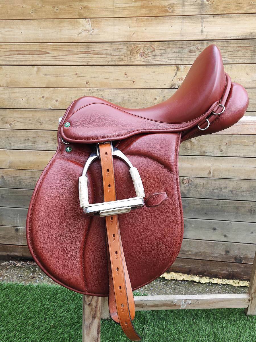 Vendue équipée avec sangle cuir de 125 cm élastiquée, étrivières cuir et étriers