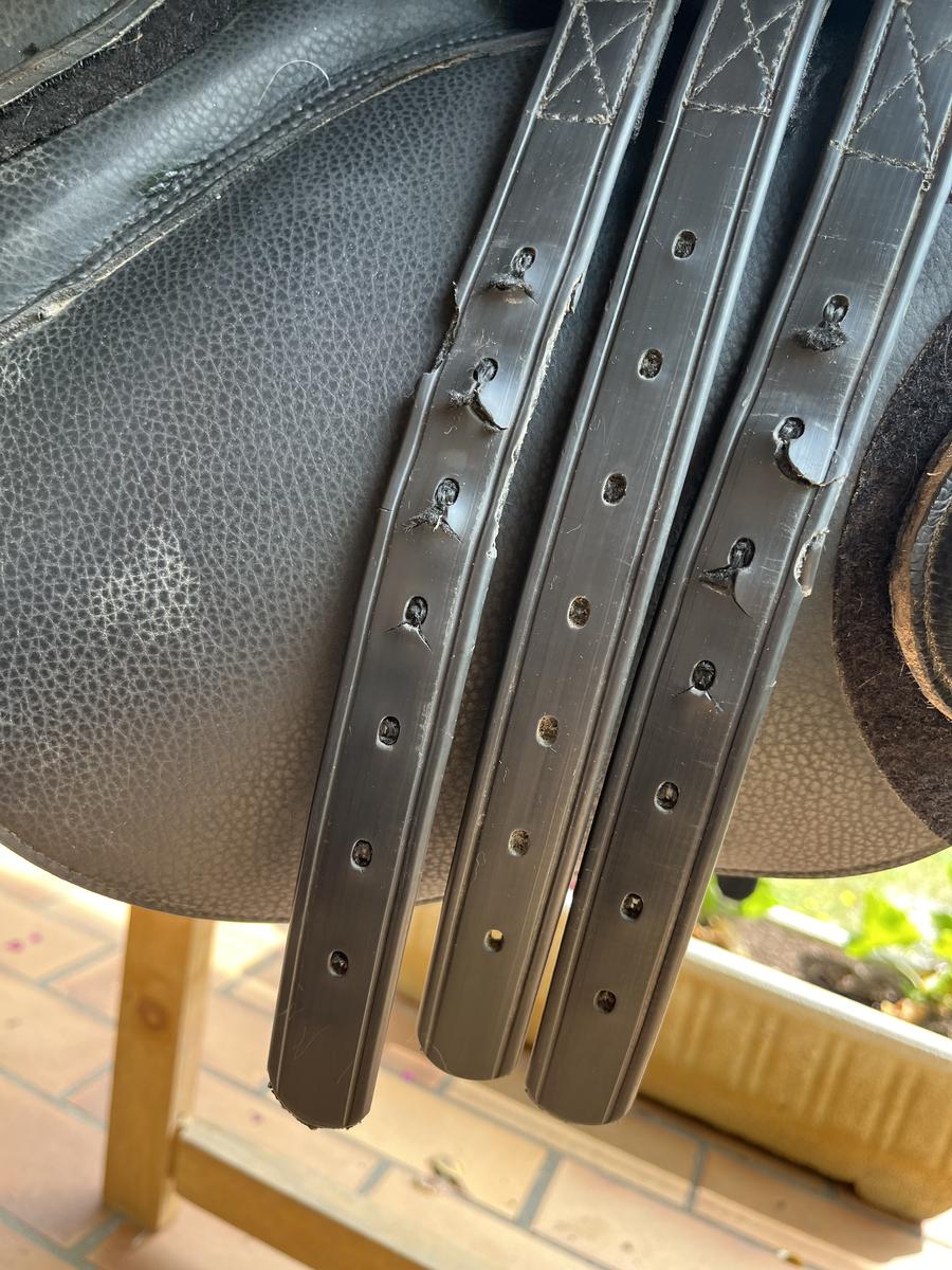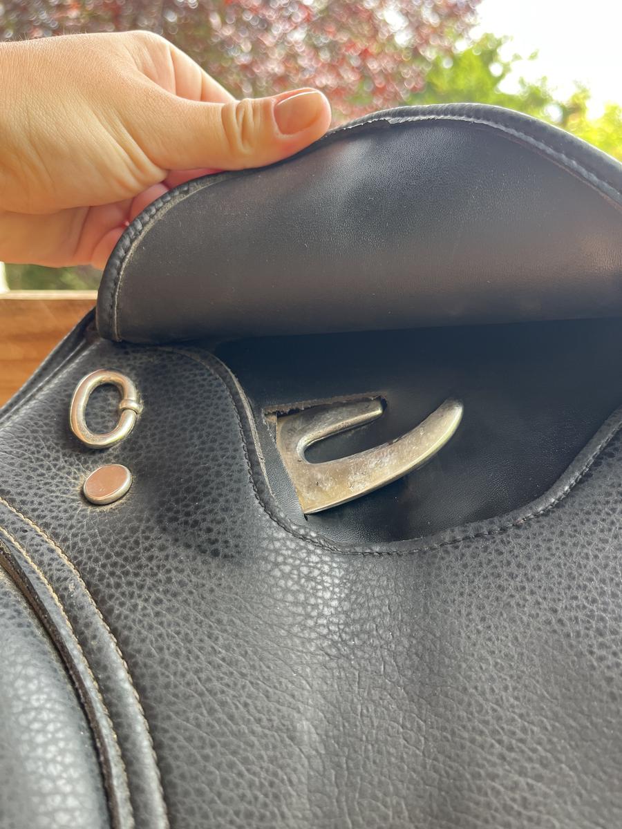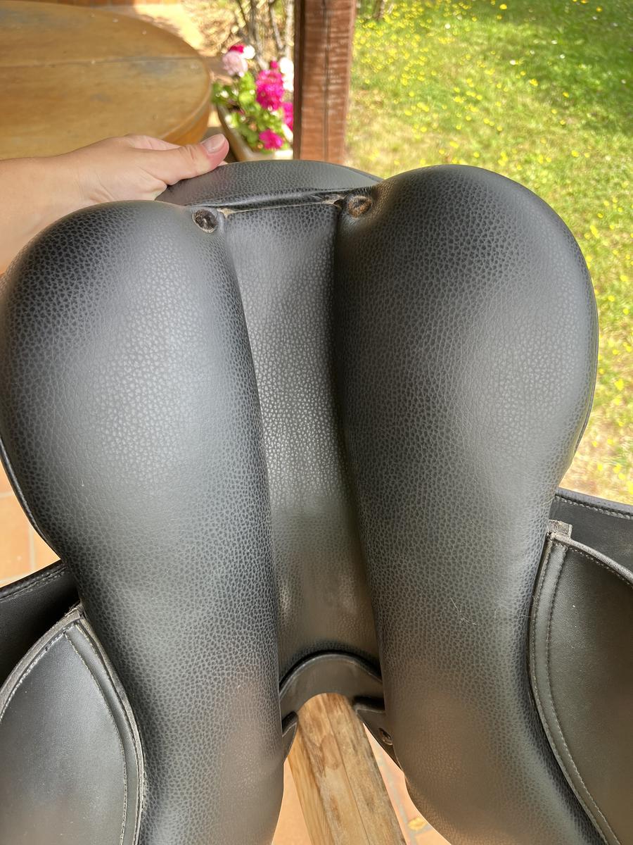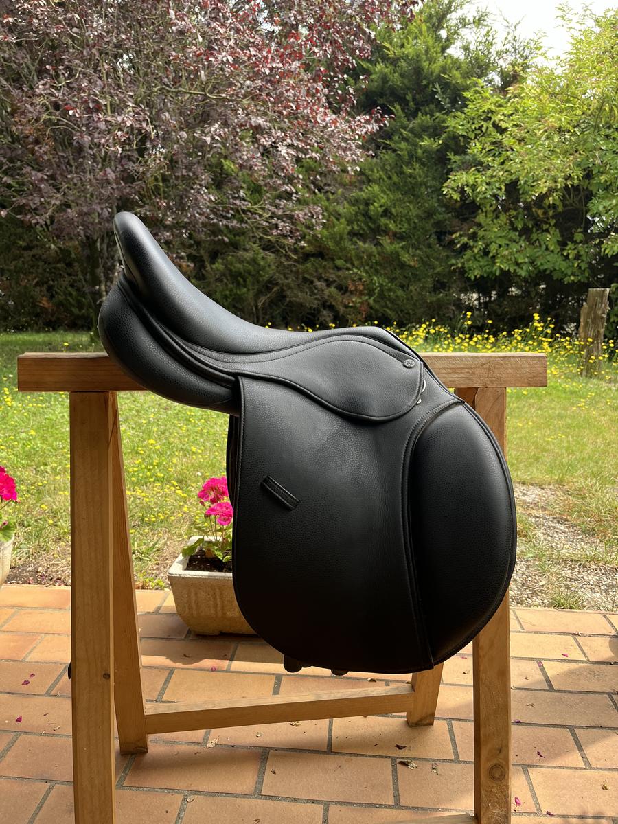 Elle est vendue nue avec son couvre selle, possibilité de vendre avec une sangle bavette Éric Thomas en cuir noir en 115cm (60€).