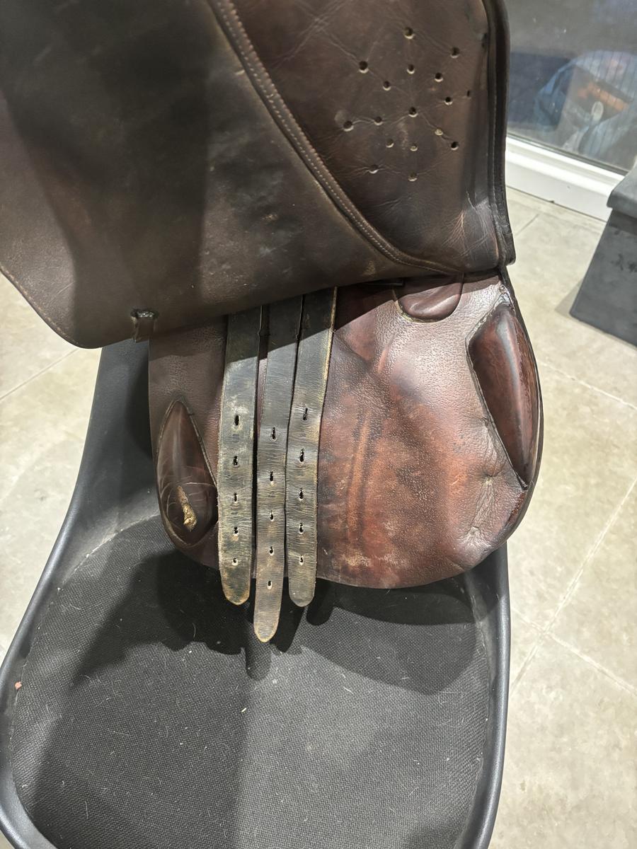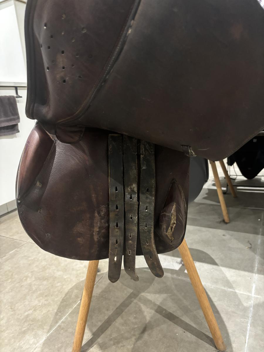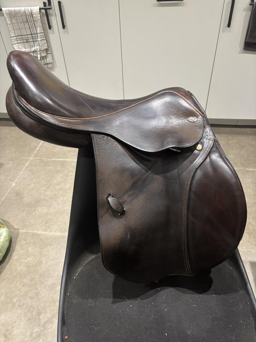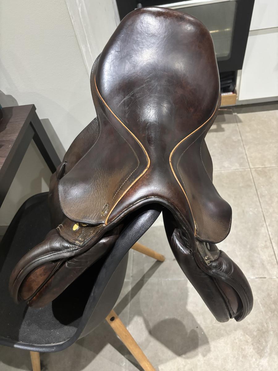 Selle Éric Thomas, taille 17,5. Possibilité d’être vendue avec étriers et étrivières. Sera vendue avec sa housse. Convient pour tout type de chevaux ou poneys.