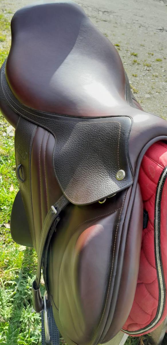 Elle est livrée avec sa housse imperméable le protège troussequin, le sac à produits avec le gant et un reste de graisse de la marque, une sangle bavette cwd cuir et mouton taille 60 et étrivières mono branches taille 80 en excellent état et deux Étriers Sprenger System-4.