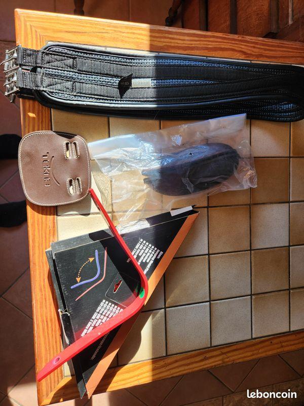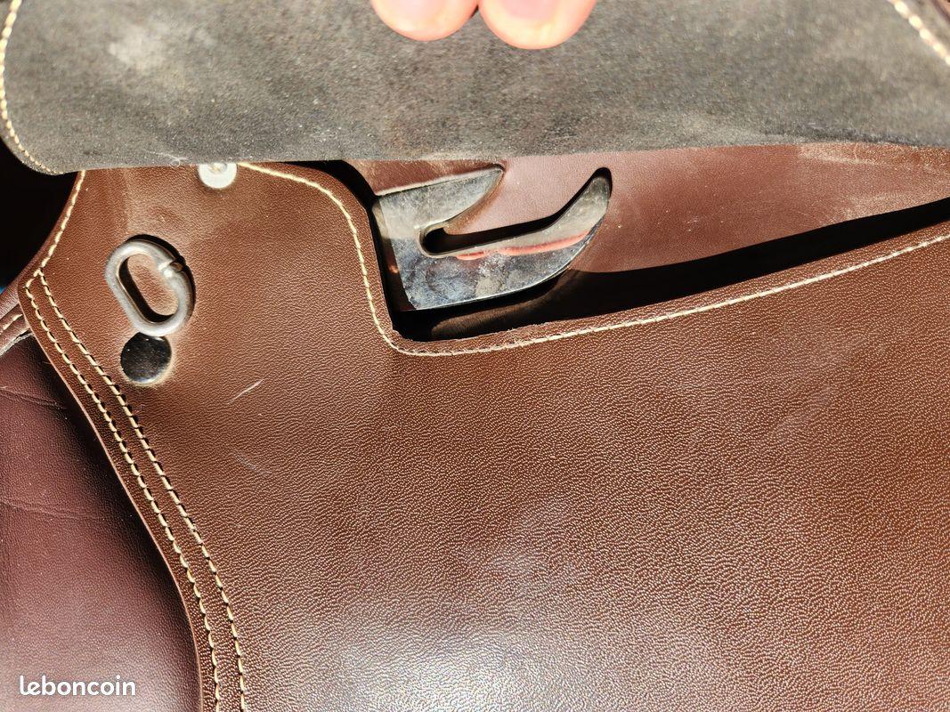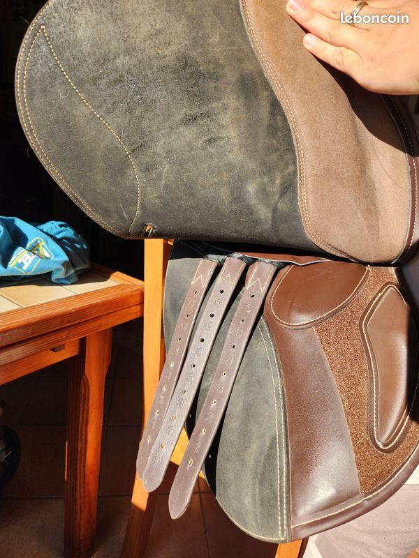 Je la vends avec sa housse, une paire de taquets pour le saut et une mixte, une sangle 120cm et deux arçons (le basique et un extra-wide pour les chevaux de semi trait ou plus large et sans garrot) mais sans étriers ni étrivières. Elle possède également une attache pour fixer un dessous de queue.