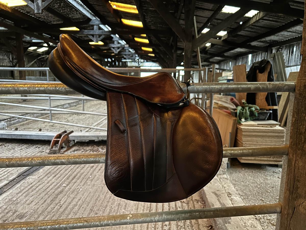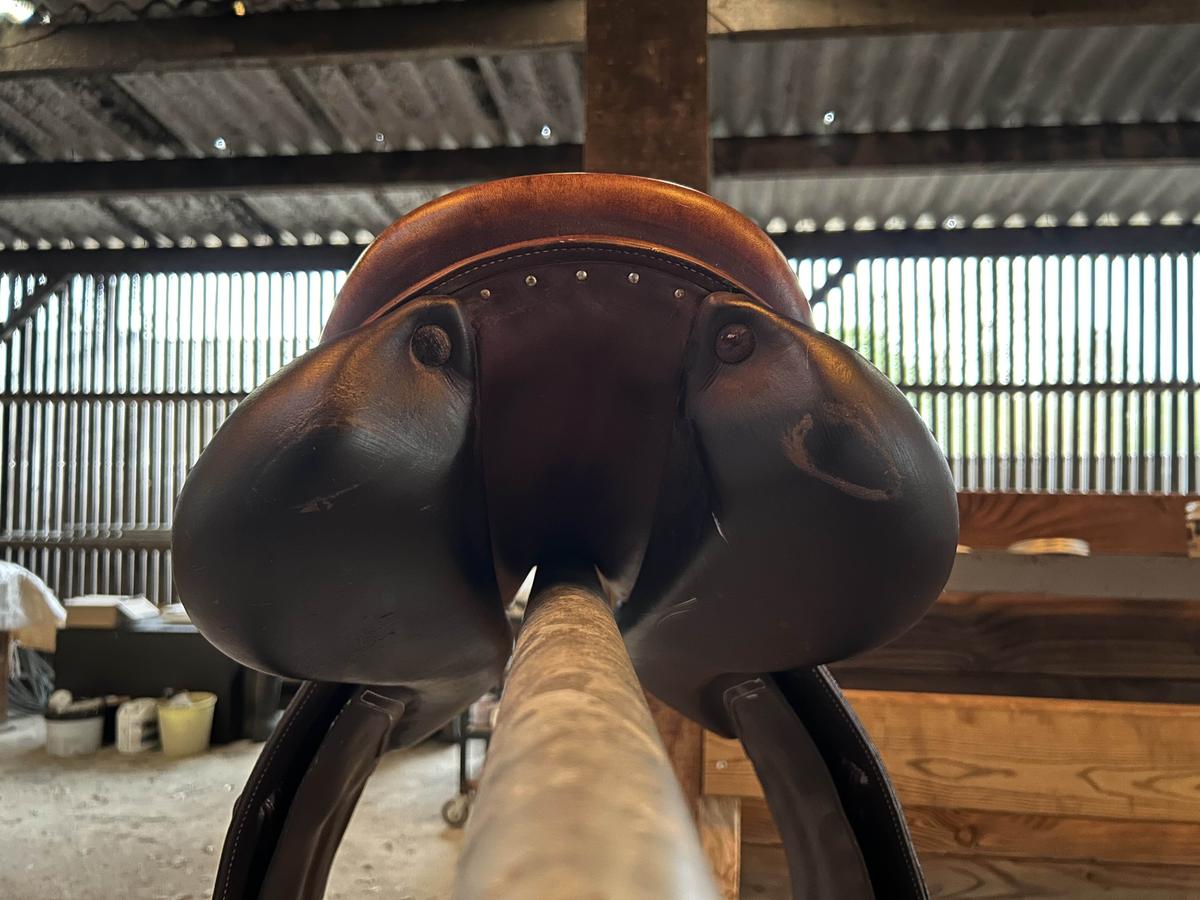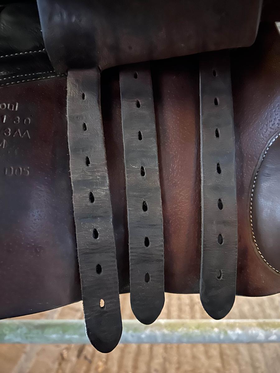 Vendue avec sangle 135cm (pas de marque) + étrivières (classiques décathlon) + étriers Flex-on + housse Forestier matelassée.