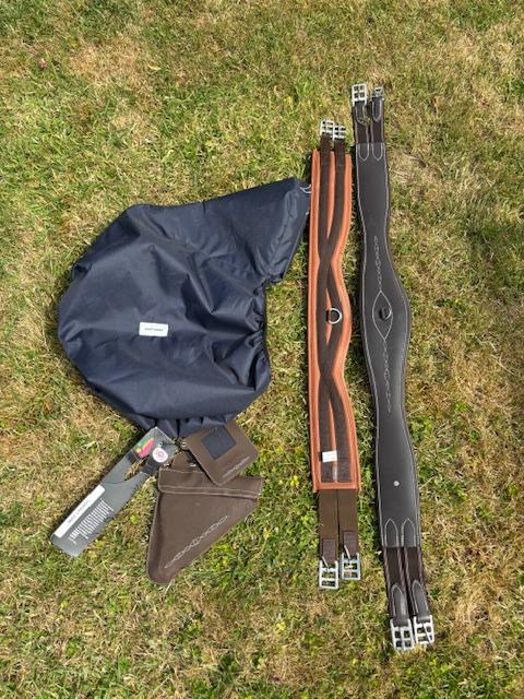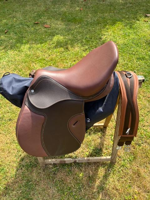 Vendue avec une sangle marron NEUVE 115cm, une sangle en cuir noire NEUVE 135cm et son couvre selle neuf.