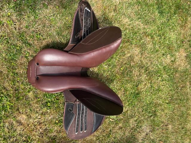 Vends selle en cuir Taille 17.5 marron, tres peu servie (comme neuve), avec ses arcades interchangeables