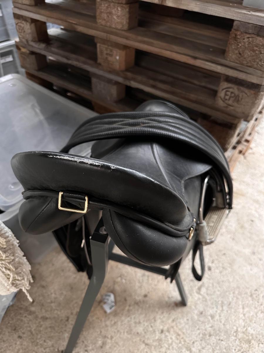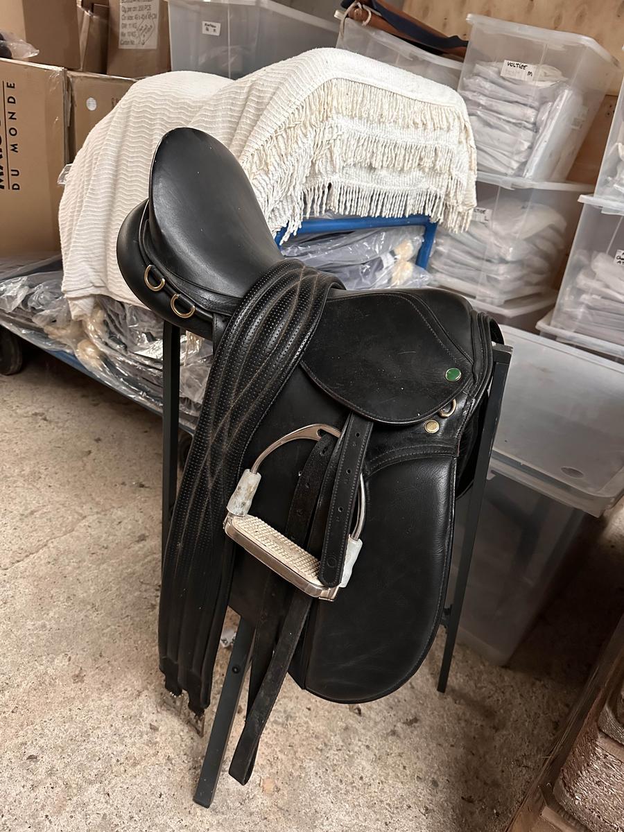 Selle equitation en cuir noir en très bon état. Pour usage loisir. Vendue avec l’ensemble : étrivières / étriers / sangle.