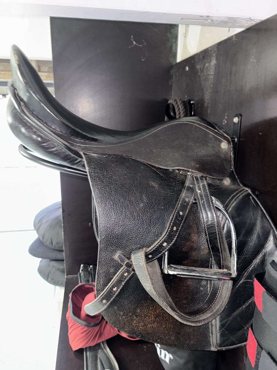 selle ayant du vécu mais peut encore servir 17,5 prix comprenant : selle, étrivières, étriers et une sangle en 125