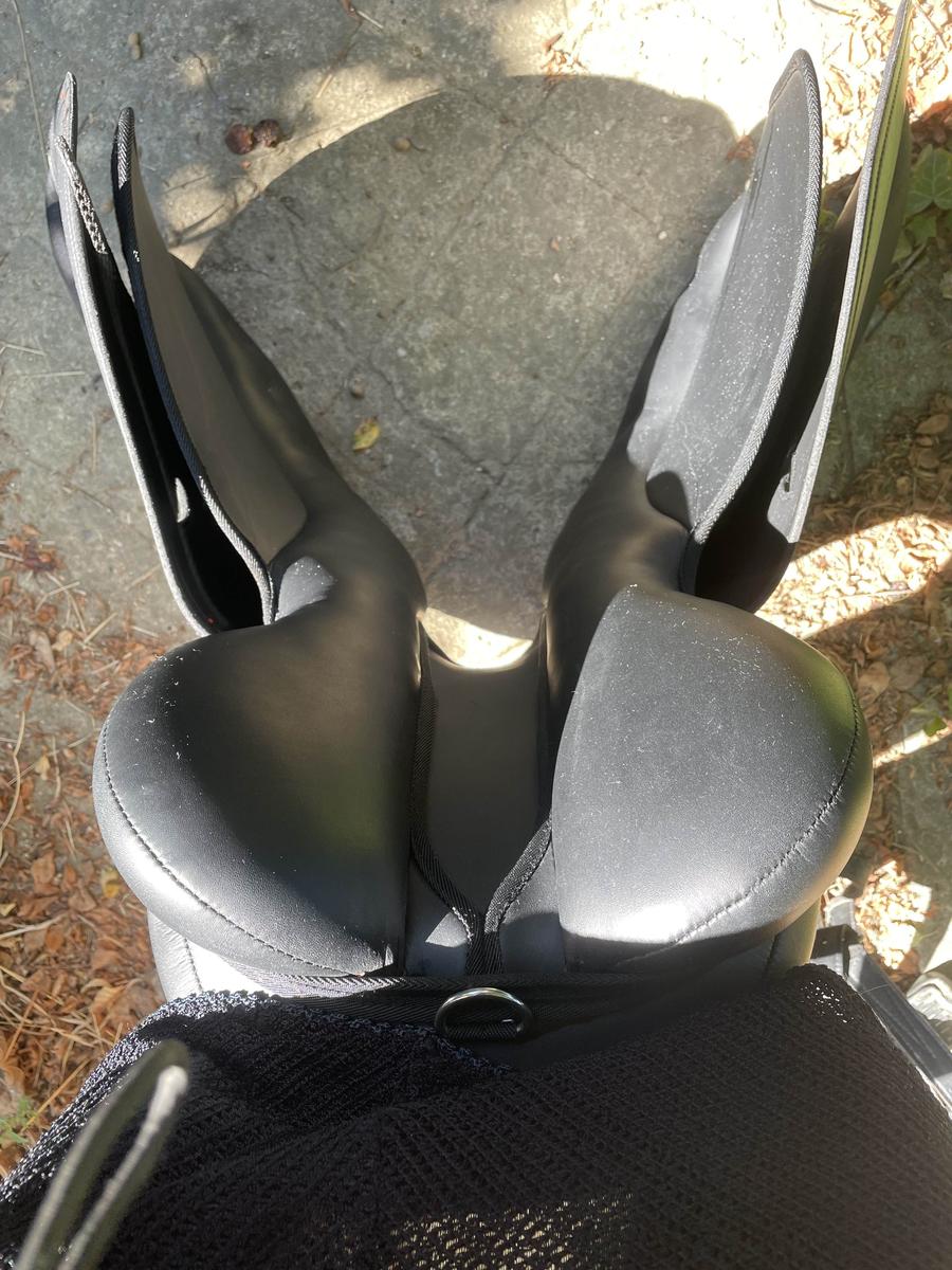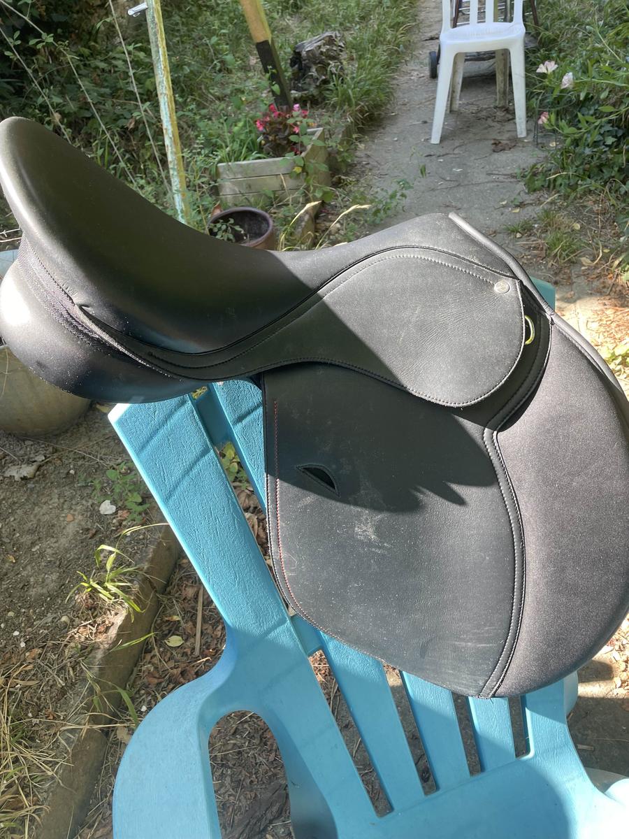 Selle Fouganza en très bonne état avec des liserais oranges , la selle est en synthétique ,les traces sont du à un mauvais lavage , c est une selle mixte pour chevaux et grand poney , c est une 17 pouces , elle a servie durant 5 ans une fois par semaine et était rangée au sec , elle est fournie avec les étrivières et les étriers , l arcades n est pas interchangeable, le prix est négociable dans la limite du raisonnable , je n ai pas la facture , ouverture de l arcade 13 cm taille du quartier 35 cm