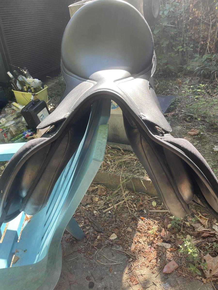 Selle Fouganza en très bonne état avec des liserais oranges , la selle est en synthétique ,les traces sont du à un mauvais lavage , c est une selle mixte pour chevaux et grand poney , c est une 17 pouces , elle a servie durant 5 ans une fois par semaine et était rangée au sec , elle est fournie avec les étrivières et les étriers , l arcades n est pas interchangeable, le prix est négociable dans la limite du raisonnable , je n ai pas la facture , ouverture de l arcade 13 cm taille du quartier 35 cm