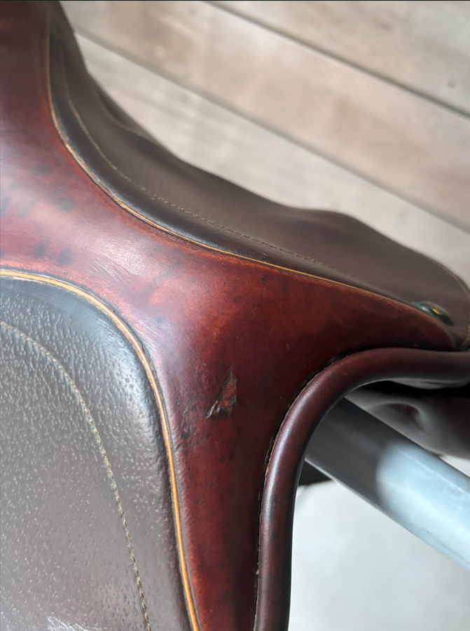 L'article a servi et montre des défauts : siège piqué, éraflure au pommeau