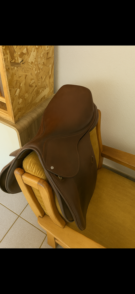 selle en cuir avec quelques accrocs mais ne gêne en rien l’utilisation, selle vraiment confortable et convient à pas mal de types de chevaux. prix négociable