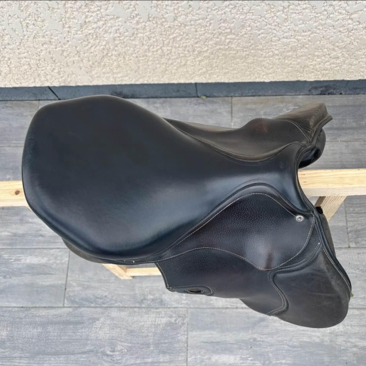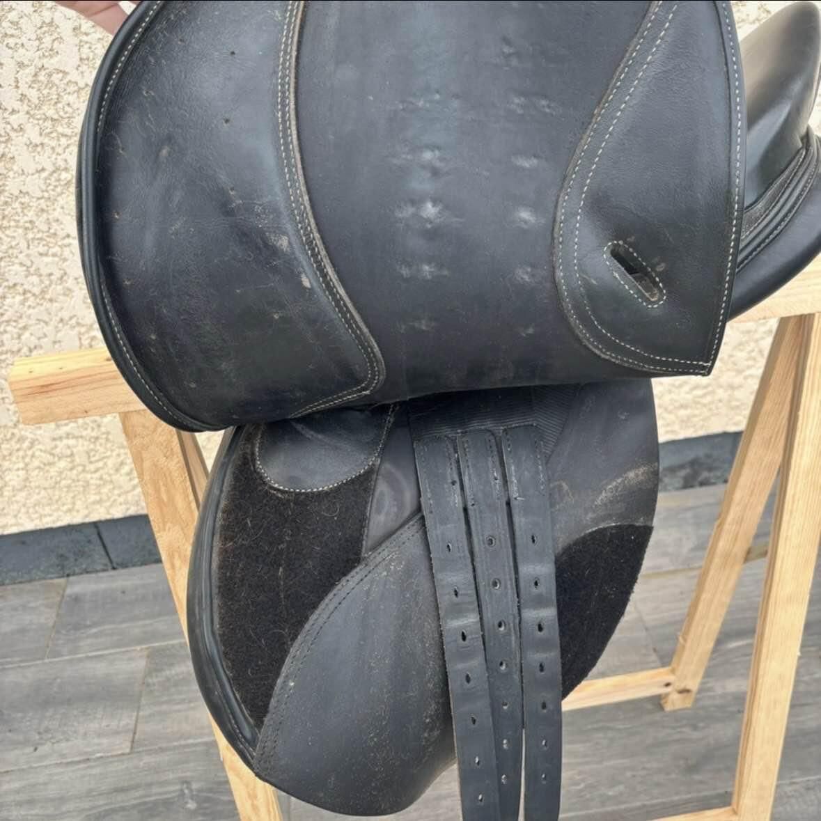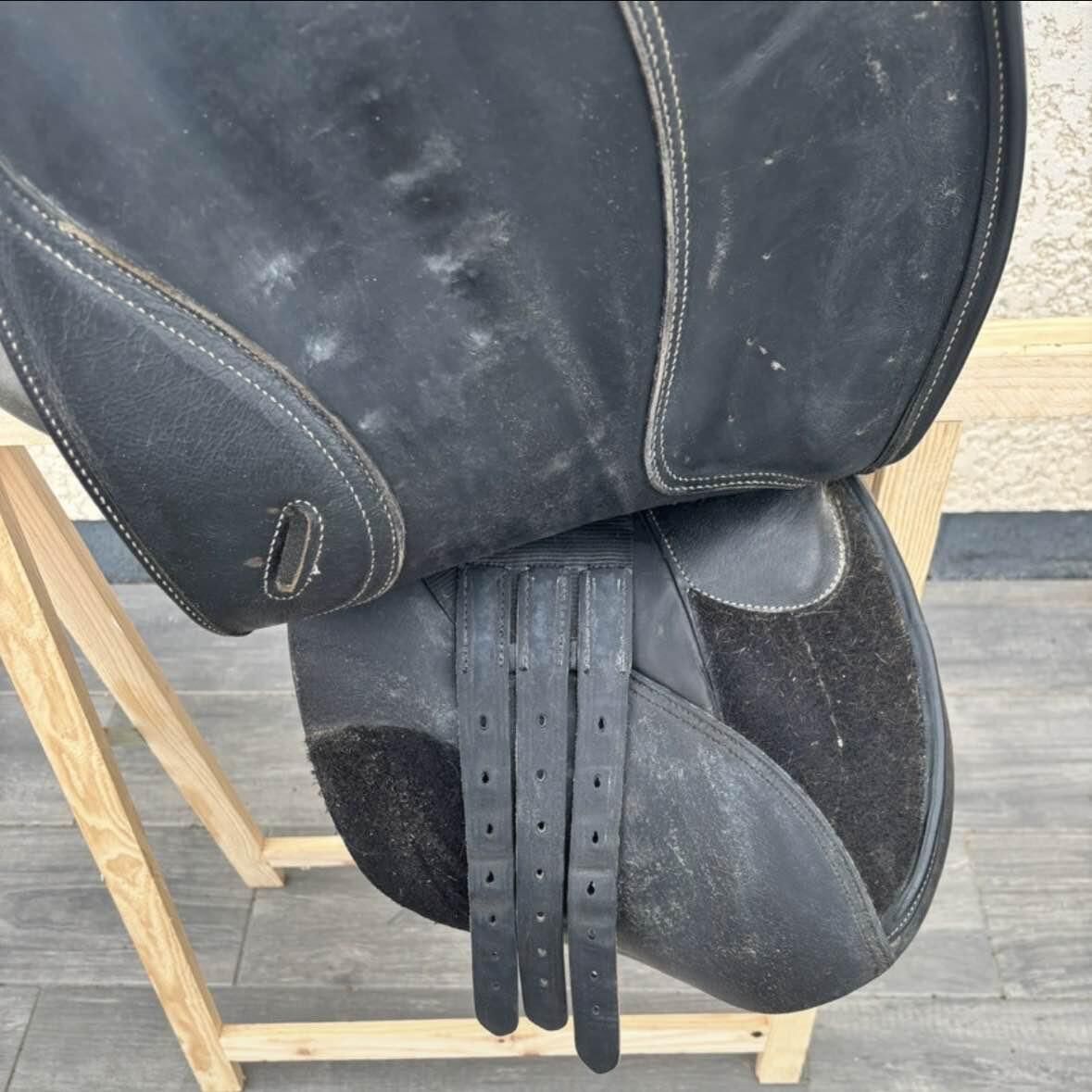 • Selle d'équitation mixte Fouganza Roméo • Noire taille 17,5 pouces • Taille cheval • Quelques traces d'usure au niveau des étrivières et des contre sanglons • Il n'y a pas les taquets