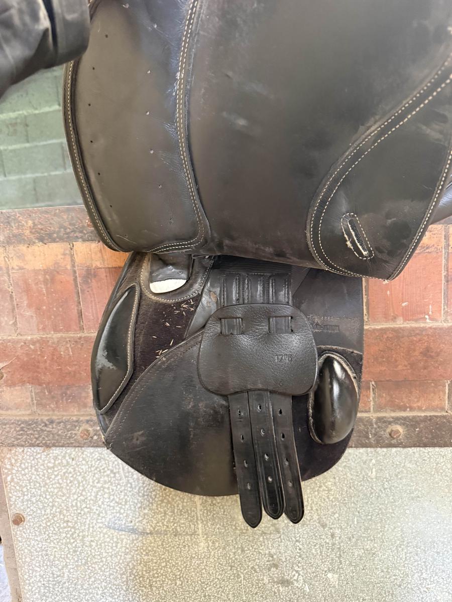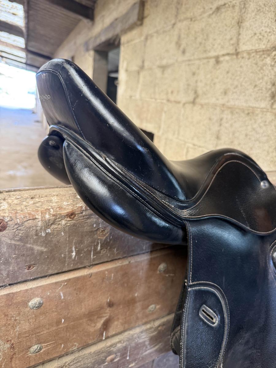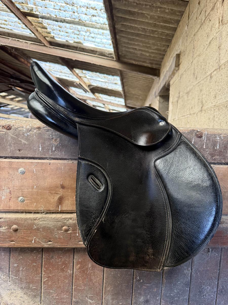 selle fouganza 17.5 pouces noir tout petit défaut de couture sur un quartier largement réparable qui ne gêne rien son utilisation Remise en main propre sur Toulouse ou envoi possible, mais pas de retour vendu avec l’arcade M Mais peut être interchangeables avec un kit Décathlon