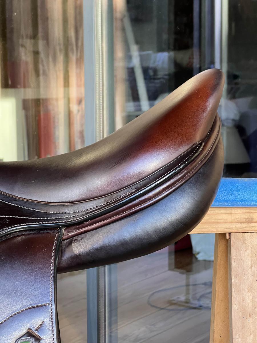 Très confortable, bonne position de jambe. Cuir entretenu régulièrement, mais un petit défaut sur le troussequin ( un peu abîmée ) voir photo.