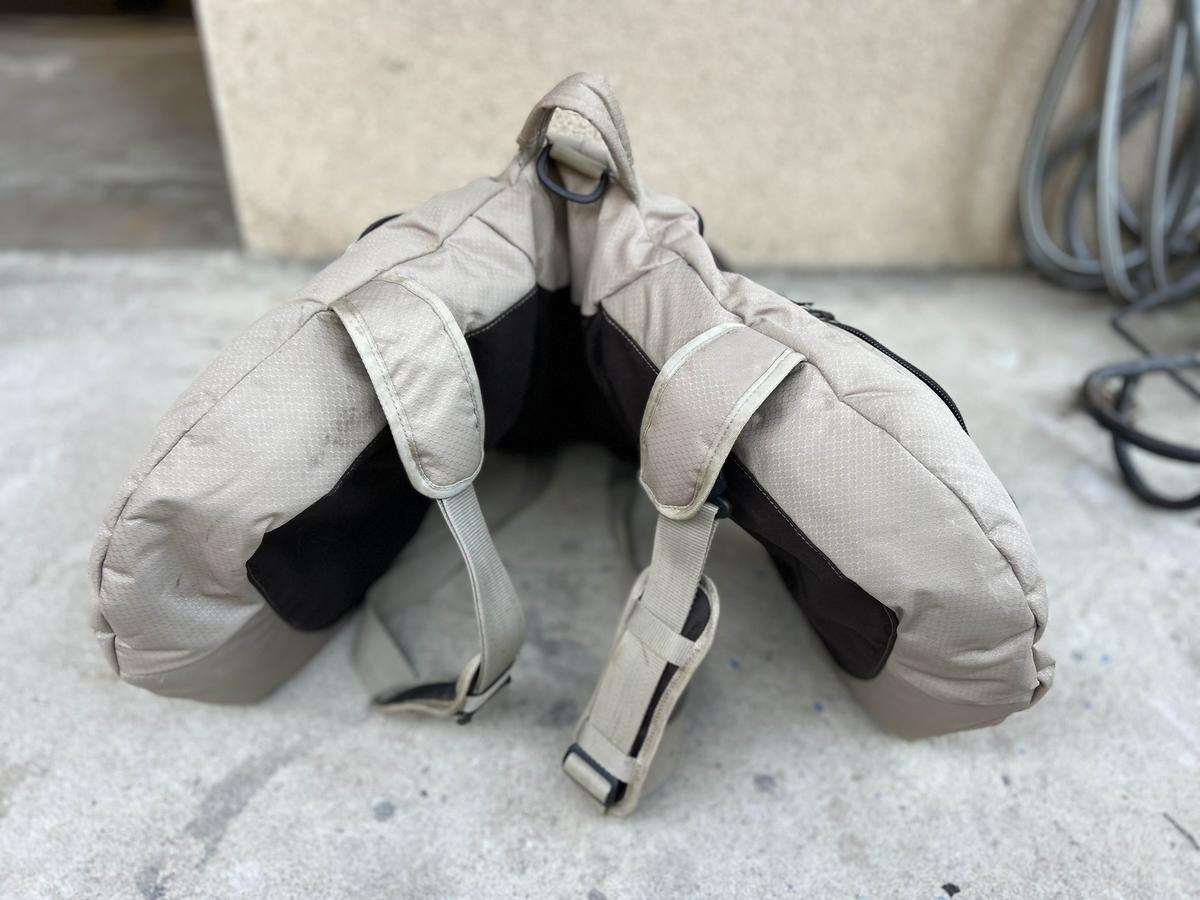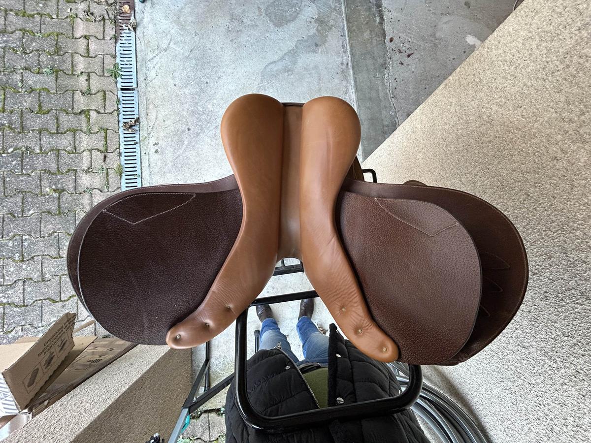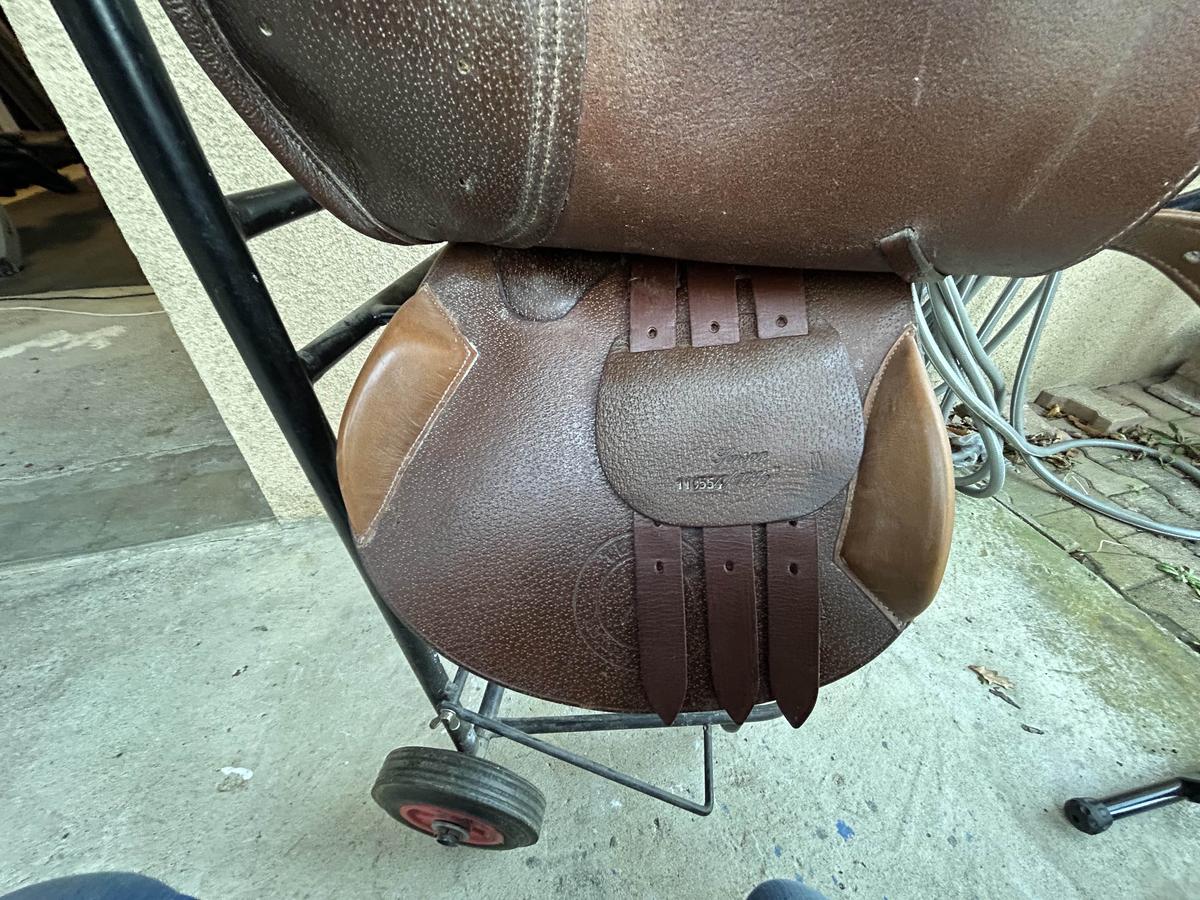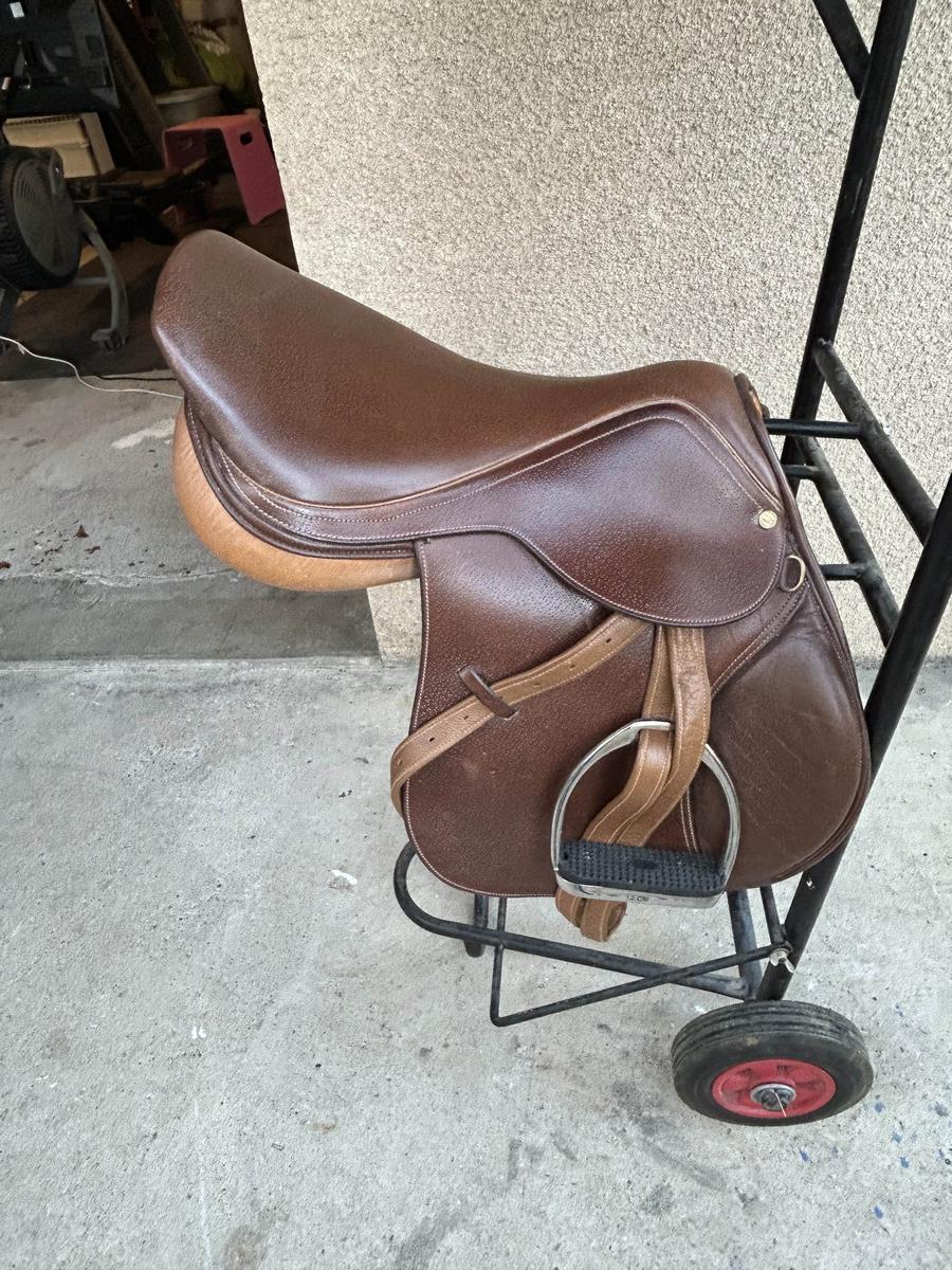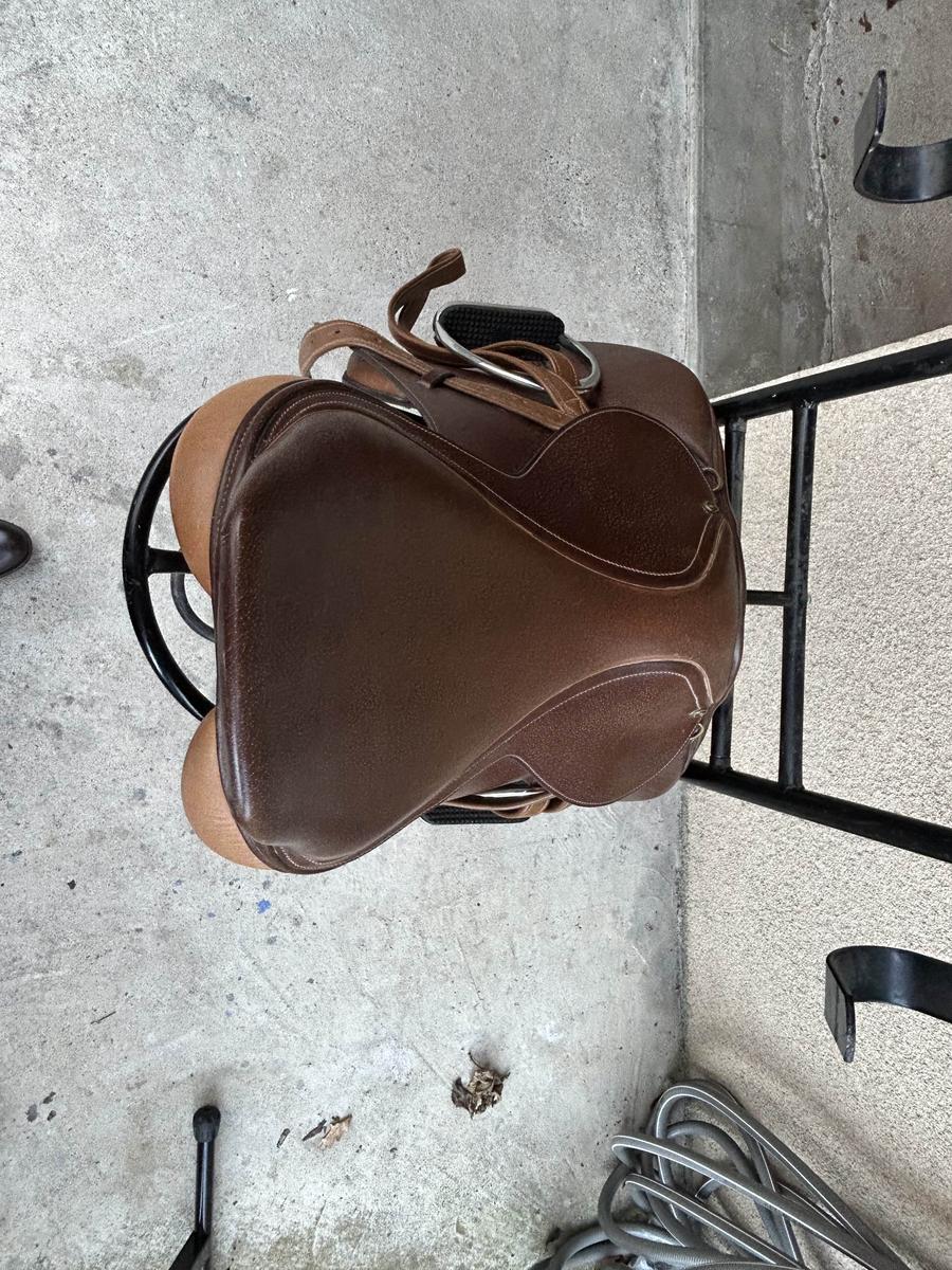 Selle marron état presque neuf car très peu utilisée, vendue avec étrivières, étriers et sac à dos de transport , année 2009, taille 17 pouces