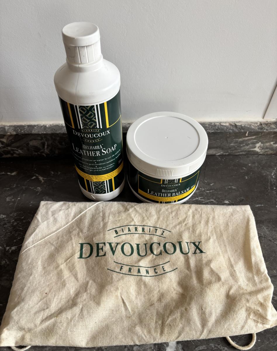 - Kit de nettoyage Devoucoux, savon, baume et gants en mouton (entamé à 1/3 environ)