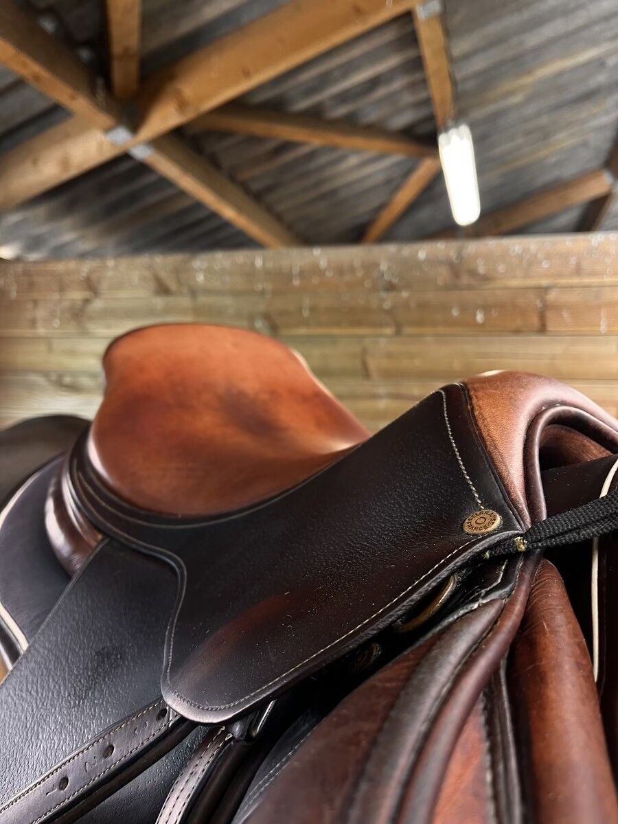 Je vends cette selle mixte / obstacle Bruno Delgrange Partition, année 2007 (marquages : 01 1707 P 17.5 / 5A). Taille de siège : 17.5pouces. Quartiers longs et ne venant pas sur l avant pour ne pas gêner les épaules du cheval. Cuir marron souple, en bon état (pas de révision récente effectuée), nettoyee après chaque utilisation Flaps 5A (longs avant normaux), idéale pour obstacle ou équitation polyvalente. Bonne conservation générale, toujours entretenue et stockée dans un endroit sec à et...