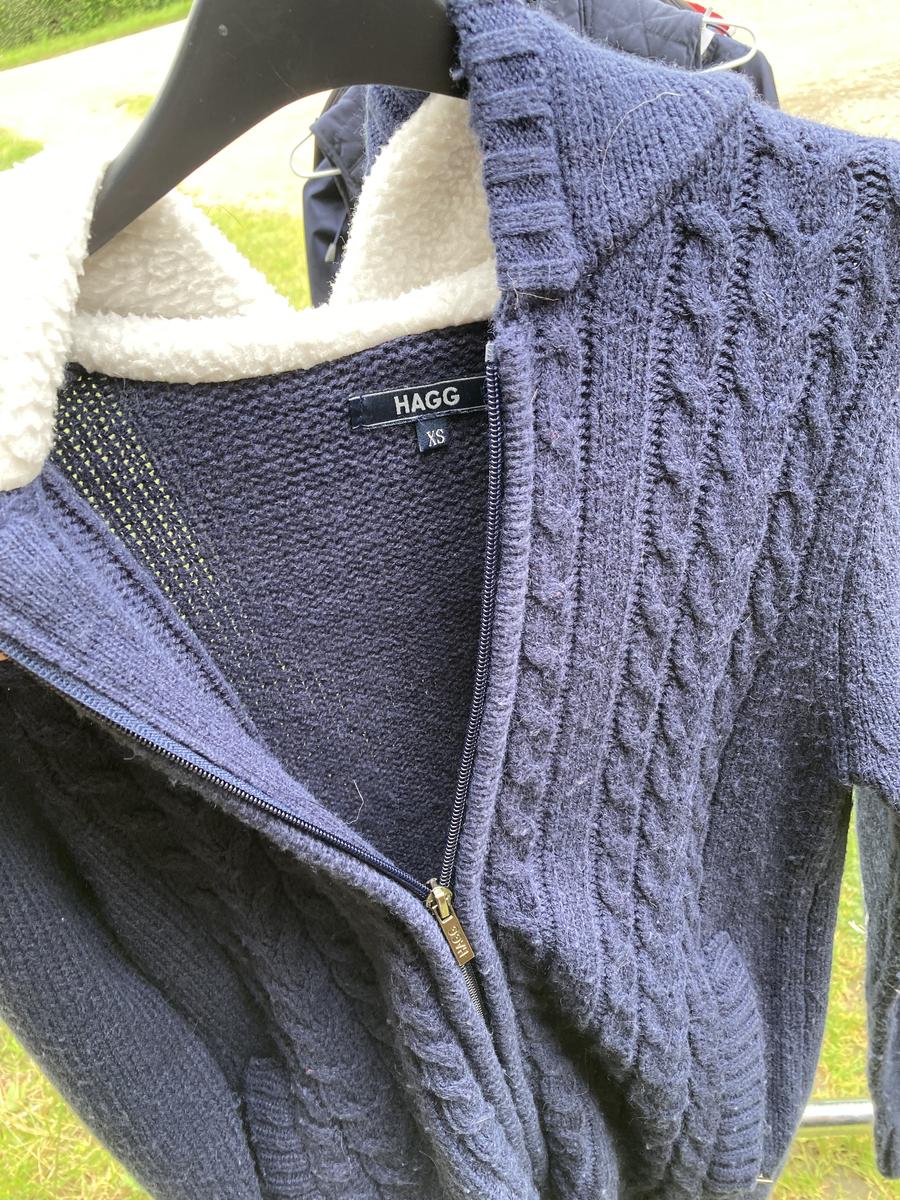 Pull en laine avec moumoute dans la capuche, taille XS, très bon état