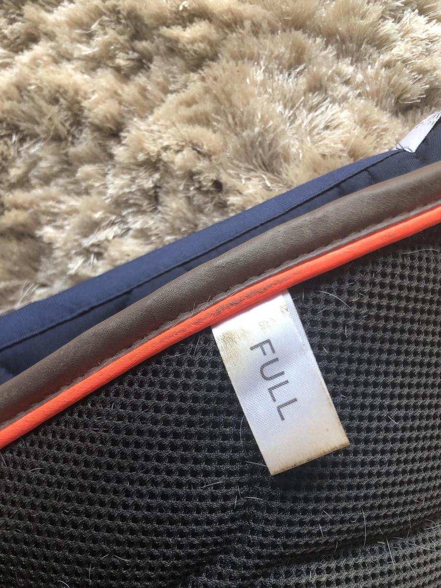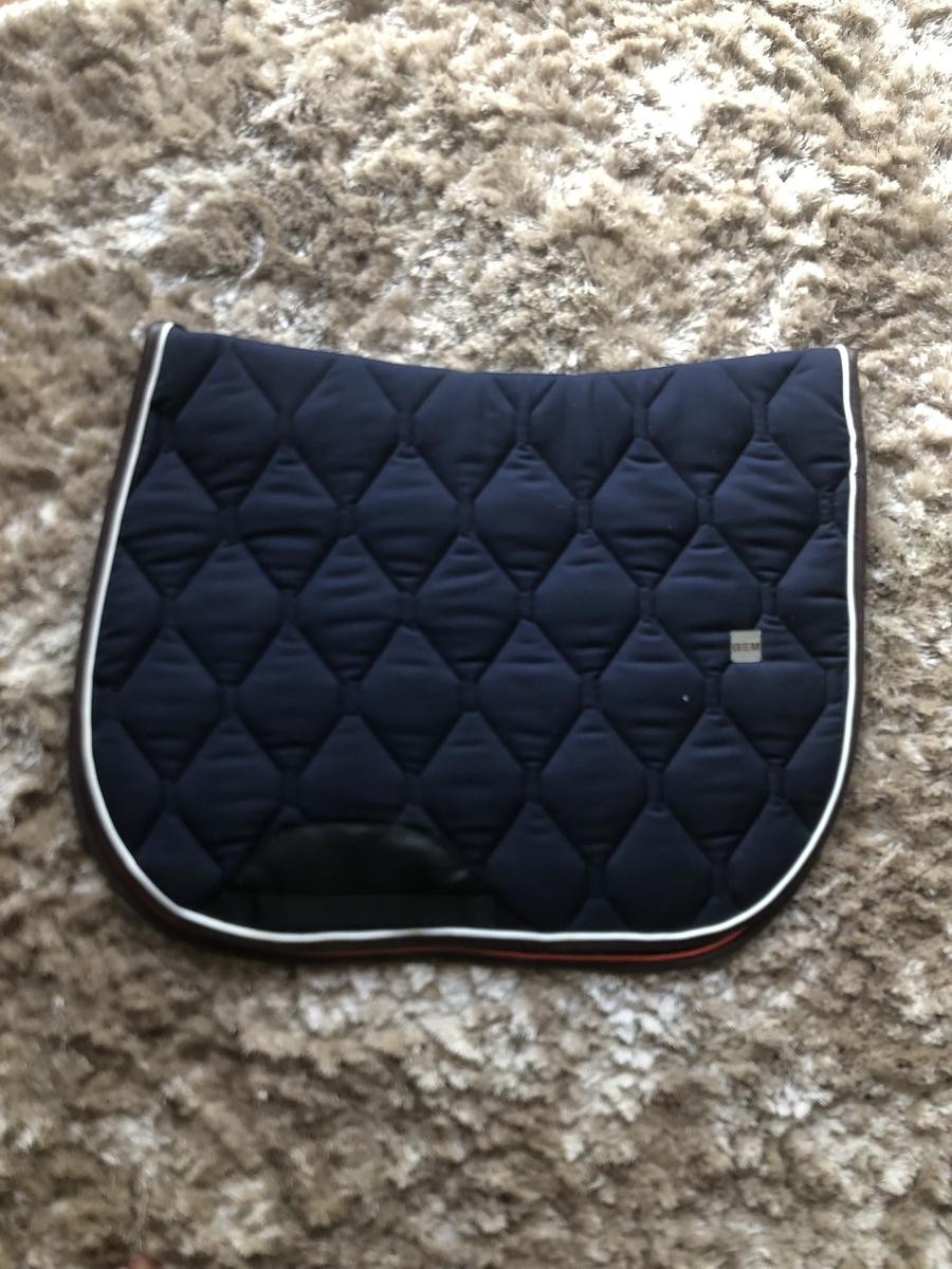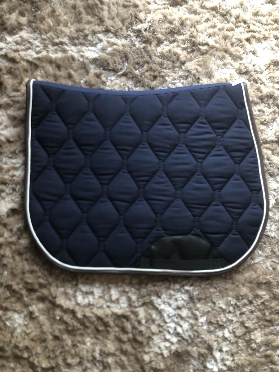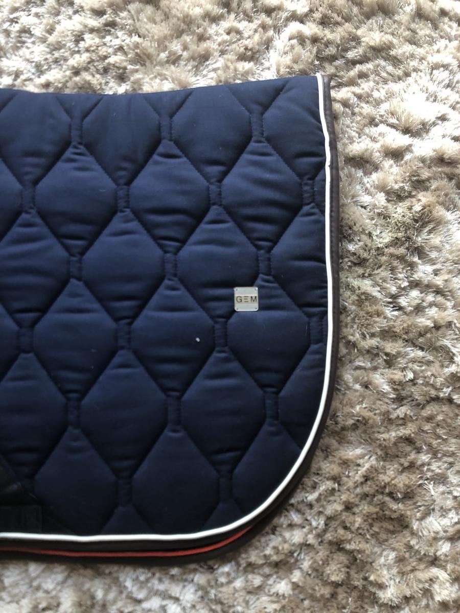 Tapis mixte gem porté 3 fois maximum en concours. Couleur bleu marine et liseré en cuir marron en excellent état juste un léger frottement sur le passage de sangle. Intérieur en nid d’abeilles, taille poney D/ Cheval.