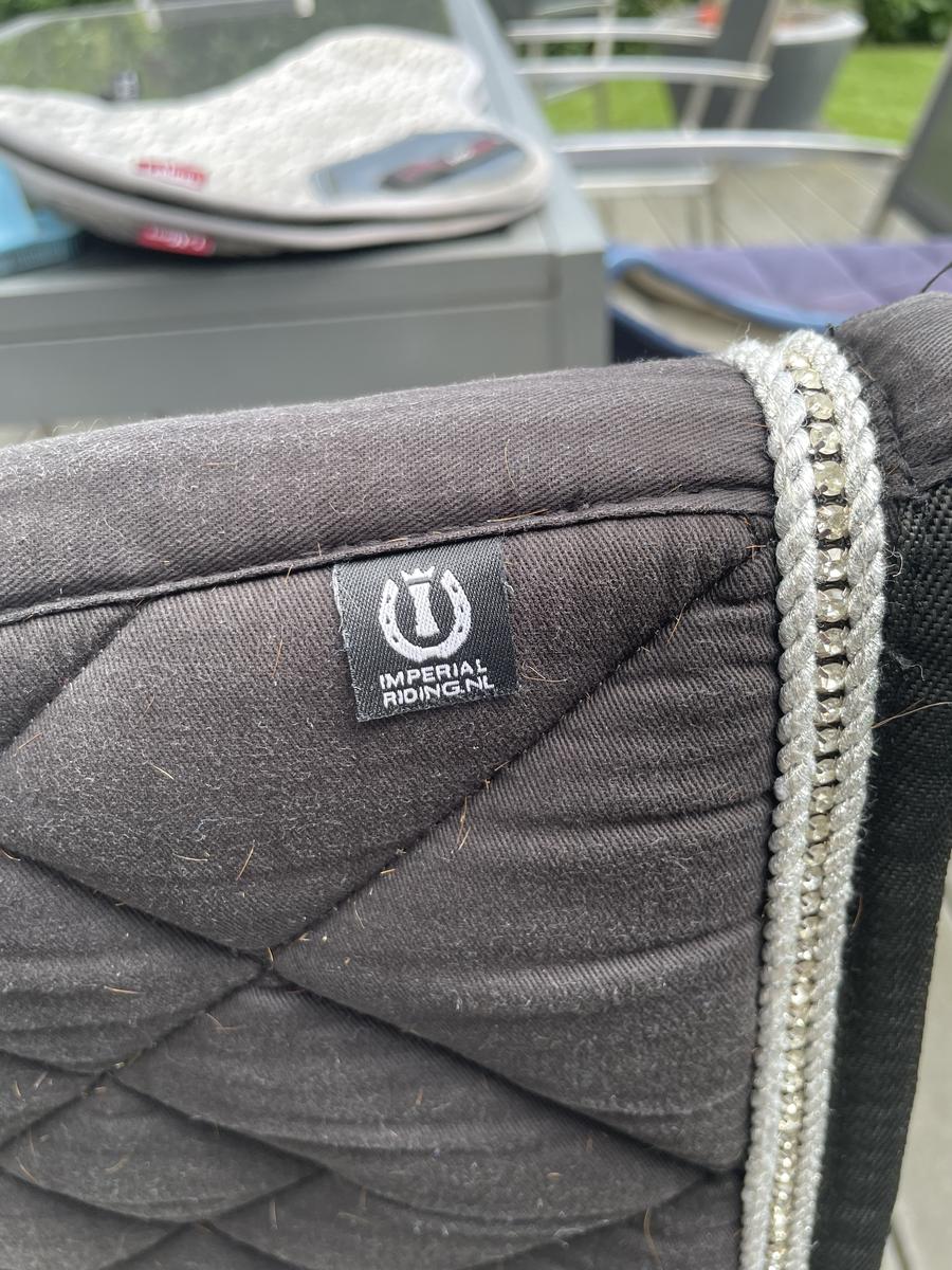 Tapis impérial riding noir forme coupée avec bordure à strass. Il s’est délavé avec le temps et en passant à la machine mais les strass sont intact.