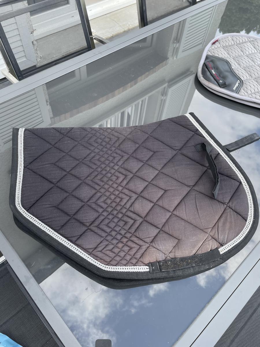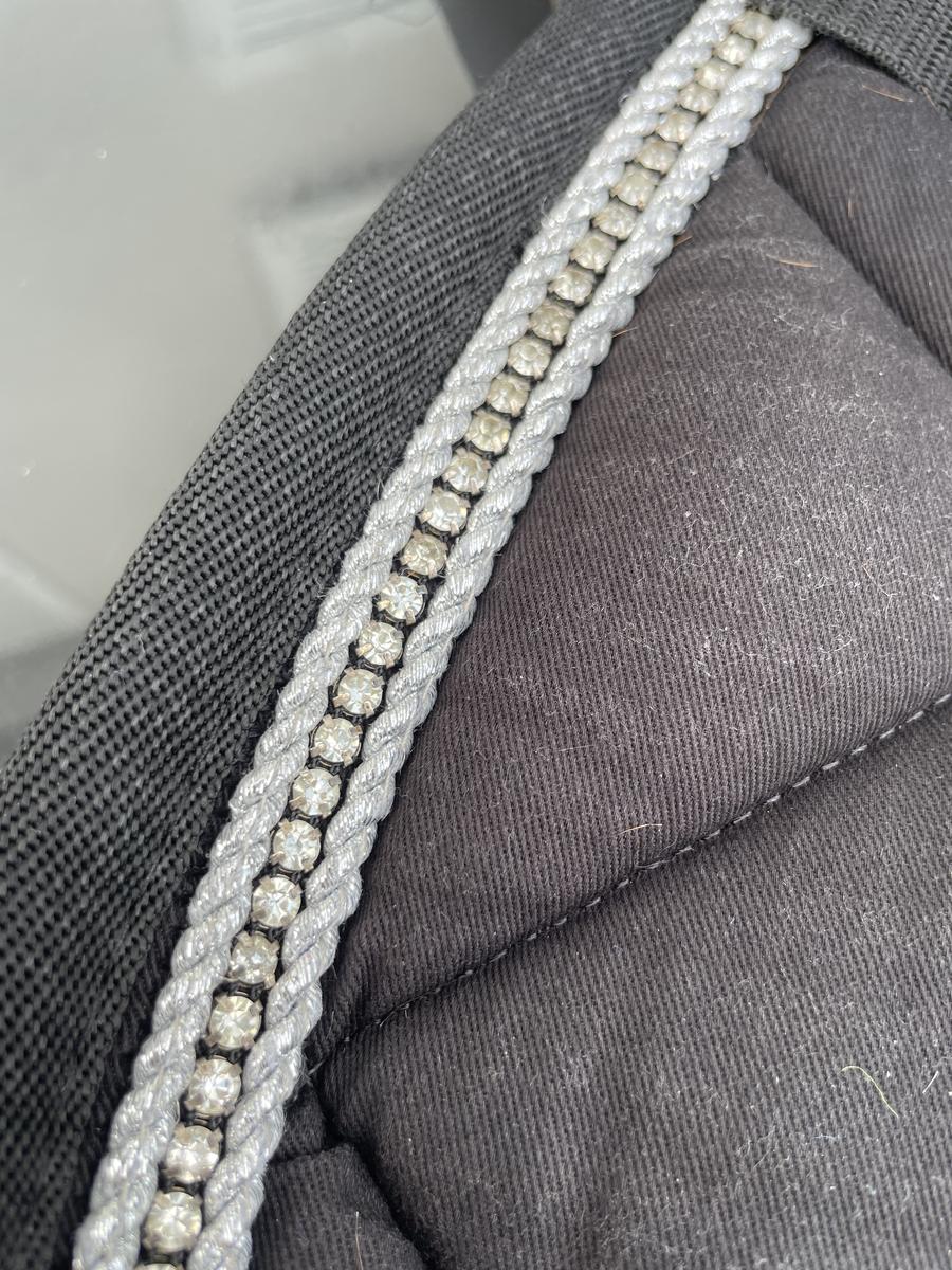Tapis impérial riding noir forme coupée avec bordure à strass. Il s’est délavé avec le temps et en passant à la machine mais les strass sont intact.