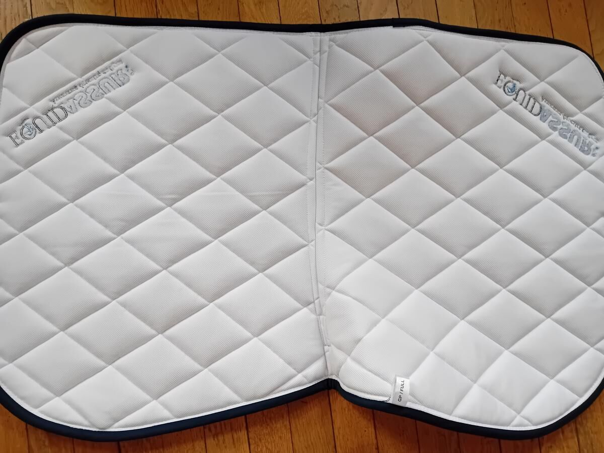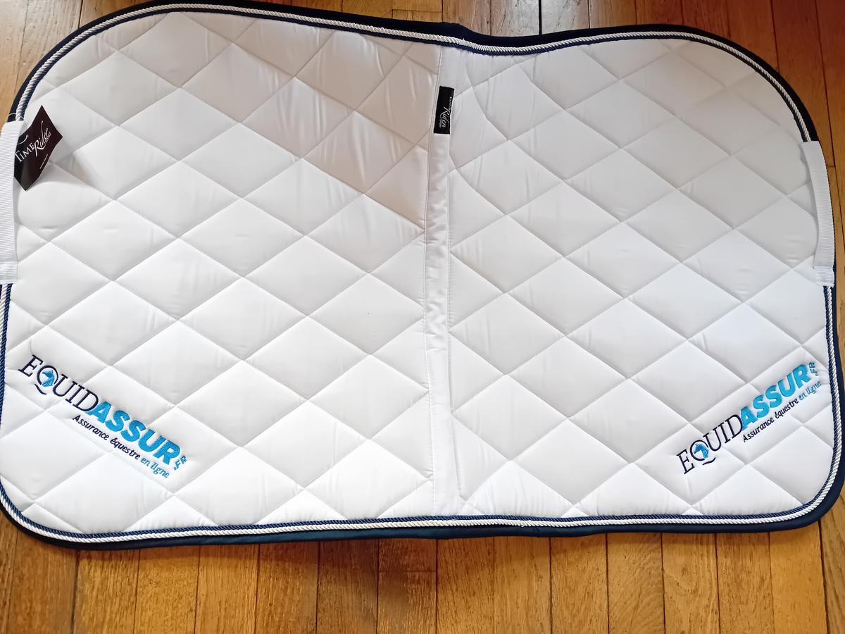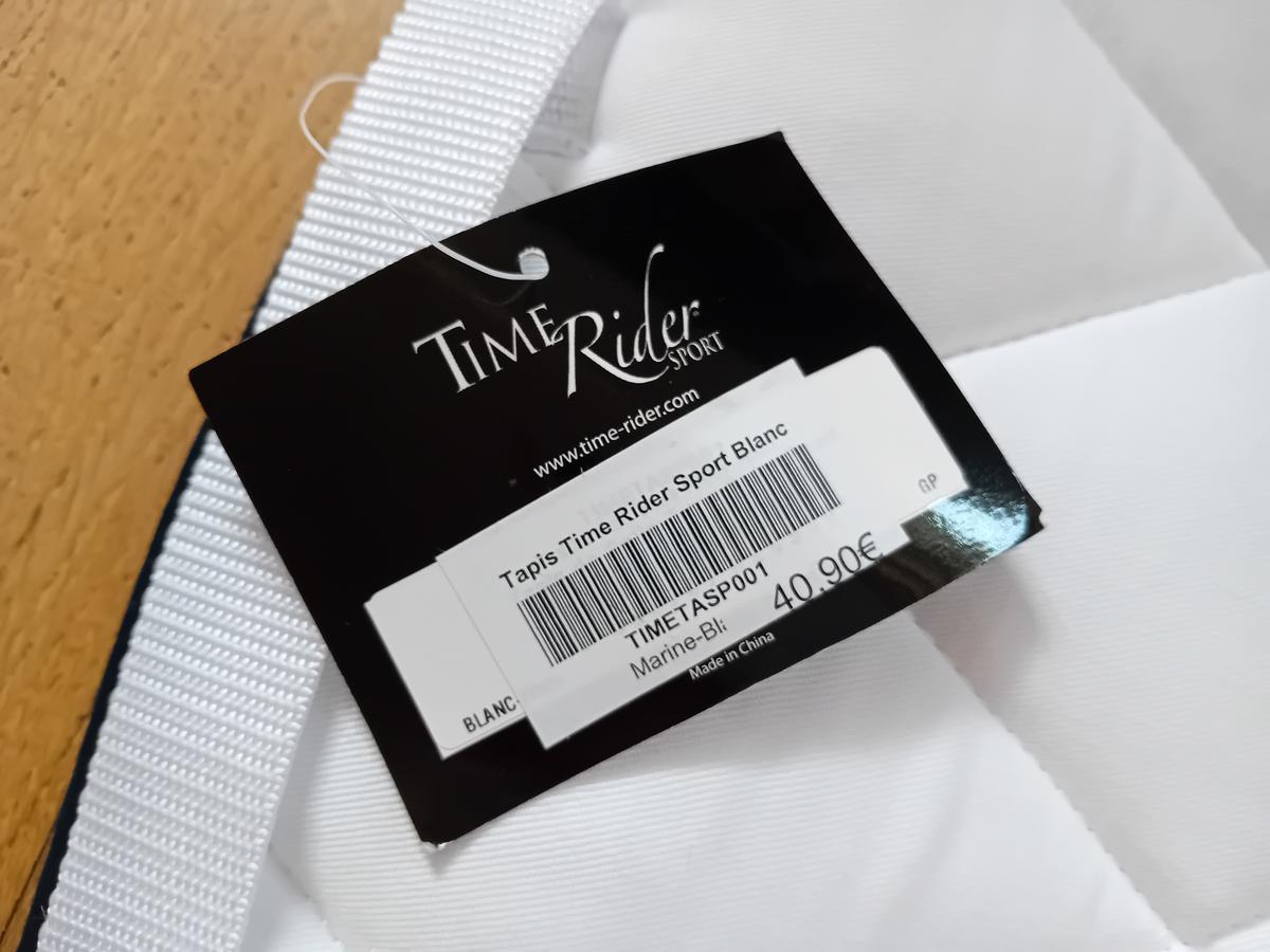 Tapis de selle Time Rider neuf.Jolis logos bleus . liserés bleu marine et cordon blanc.interieur anti transpiration. Jamais essayé. Cause vente pas d'utilisation de tapis blanc par la cavalière.