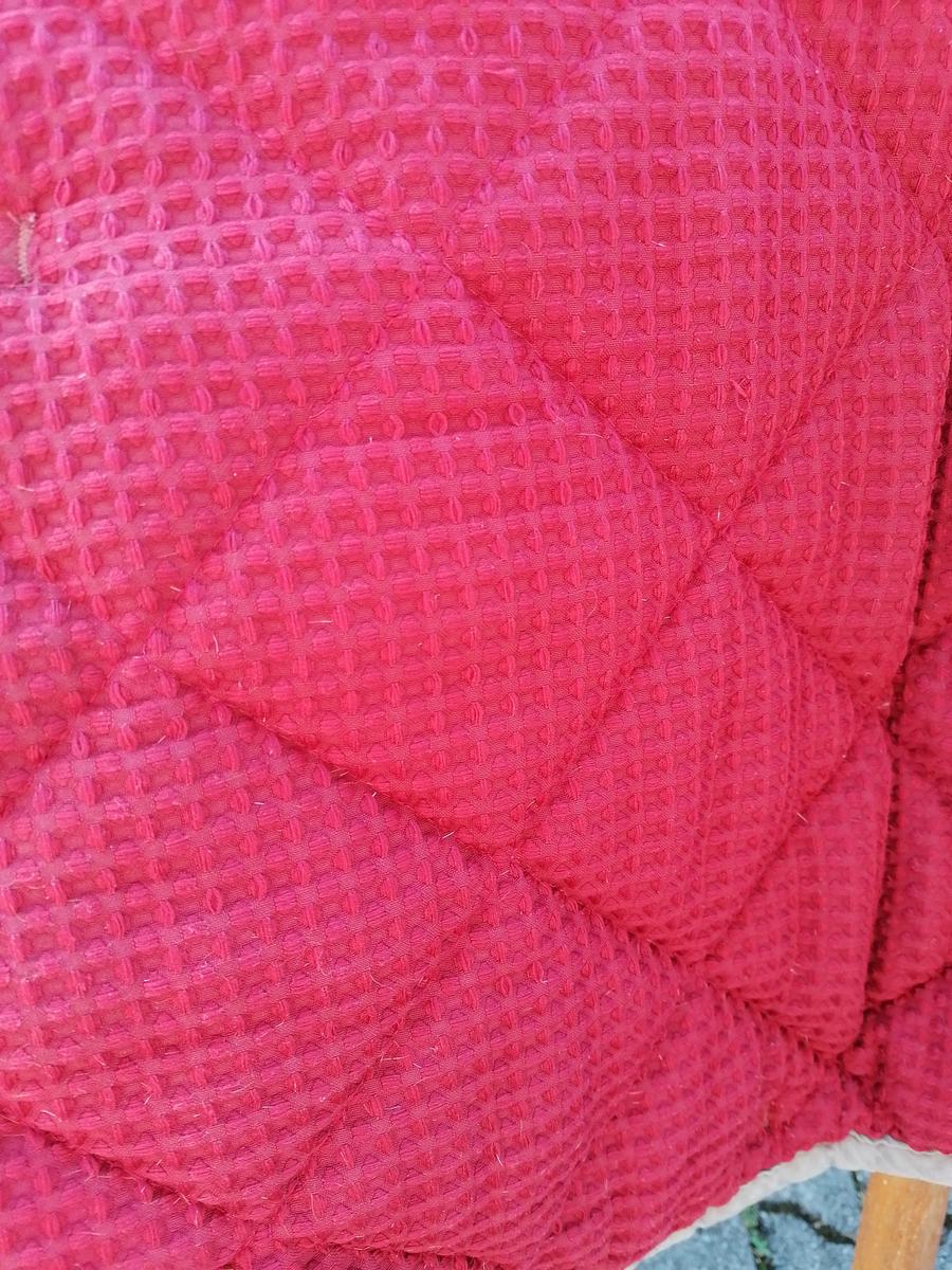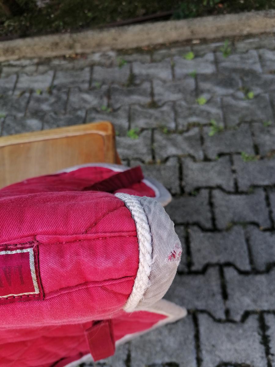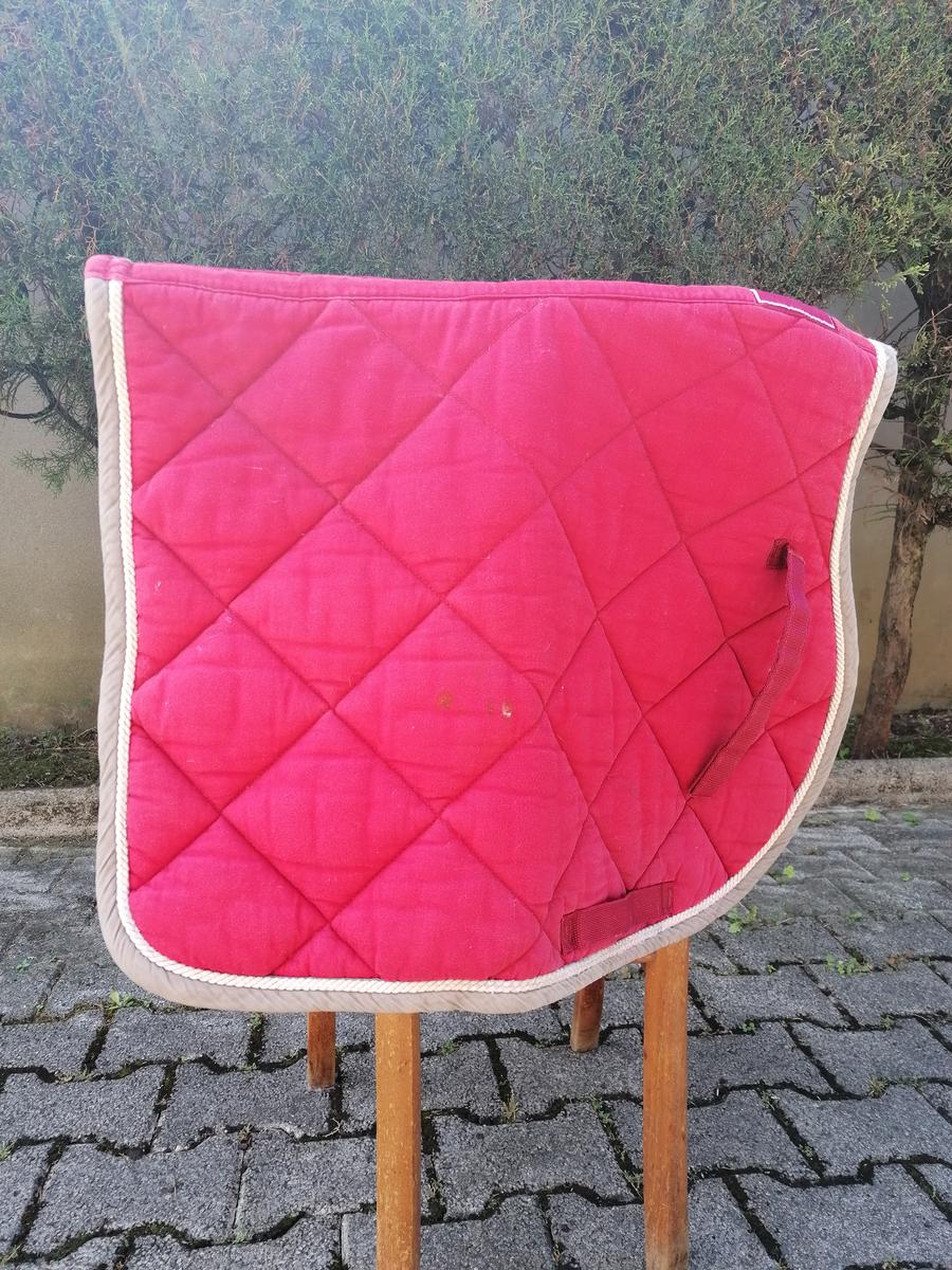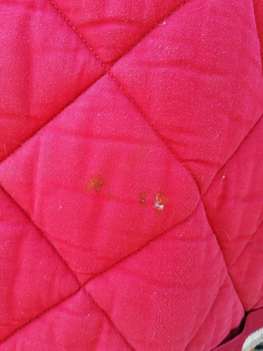 Tapis Lamicell modèle Elégance, de couleur rouge, cordelette dorée et bordure taupe. Quelques petits accrocs et tâches de rouille mais qui ne se voient pas une fois le tapis porté.