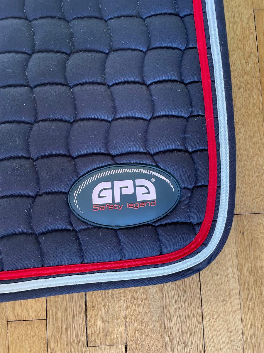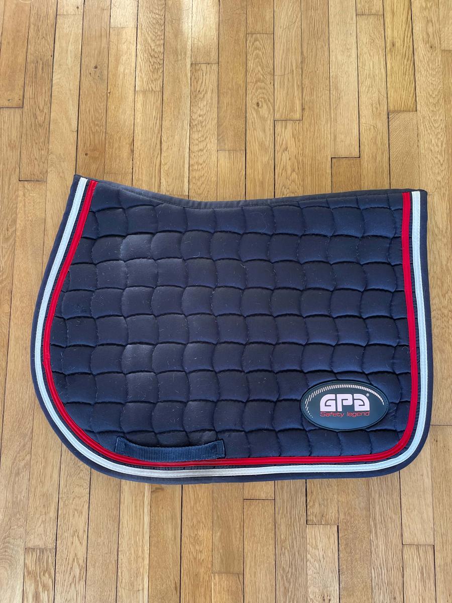 Bleu marine avec le logo sur les deux côtés, liserés rouge et blanc.