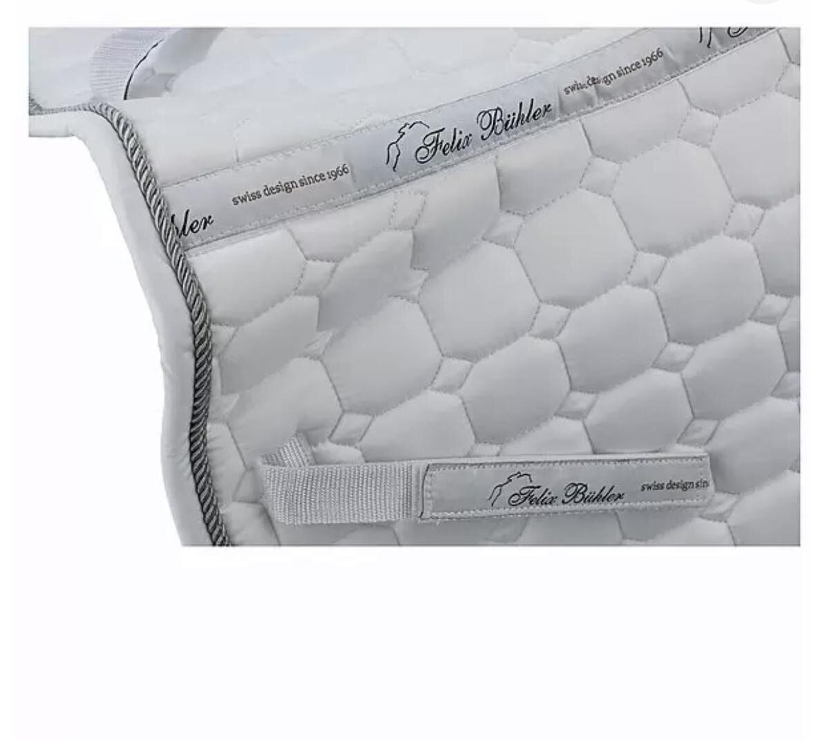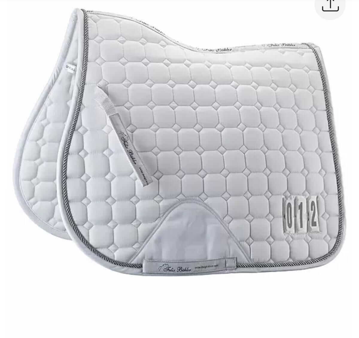 Tapis de selle indispensable pour les concours. Pochettes en PVC pour le numéro de dossard. Set de numéros en papier inclus pour chaque côté. Élégant cordon décoratif argenté. Passants de sangle et contre-sanglons avec patte auto-agrippante. Renfort anti-abrasion au niveau du passage de sangle. Dessous en tissu Air Mesh respirant et absorbant l'humidité. Retirer les numéros avant le nettoyage ! 100 % polyester.