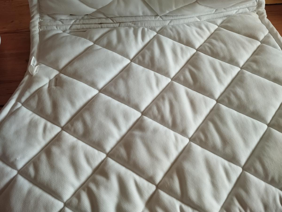 Mis 2 fois. Propre, lavé deux fois. Très très bon état, un tout petit fil qui part et une marque à l'intérieur dû au seul effort fait avec,car cela reste un tapis blanc.