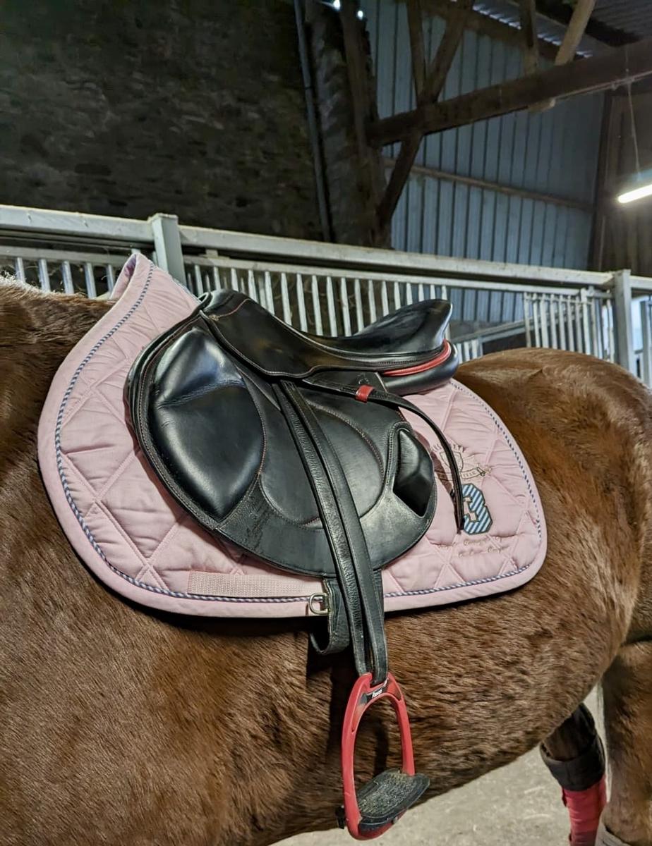 Tapis HV Polo rose pâle et détails bleu clair. Peu porté mais tâché au niveau de la selle.