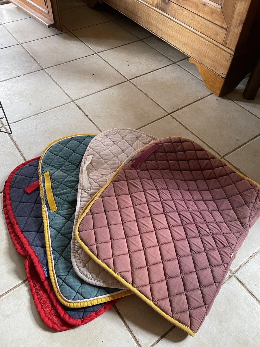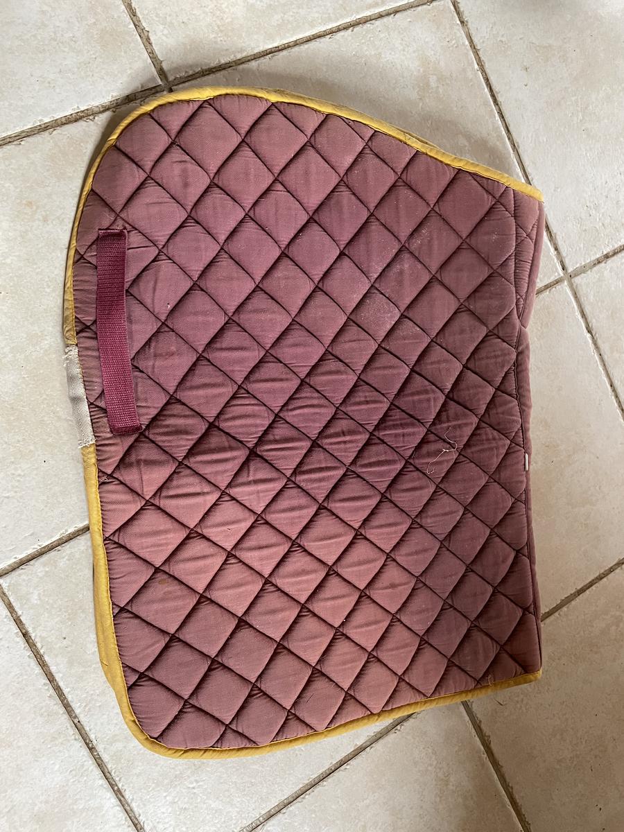 Tapis de marque inconnu, base marron un peu bordeaux, passages de sangle bordeaux, bord jaune et renfort blanc aux passages de sangles.