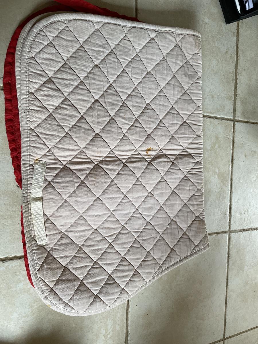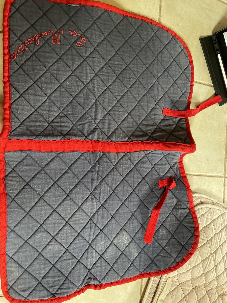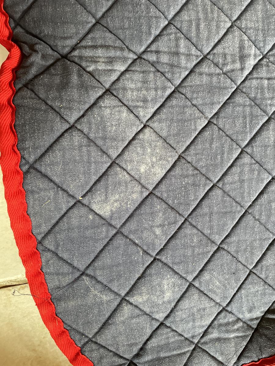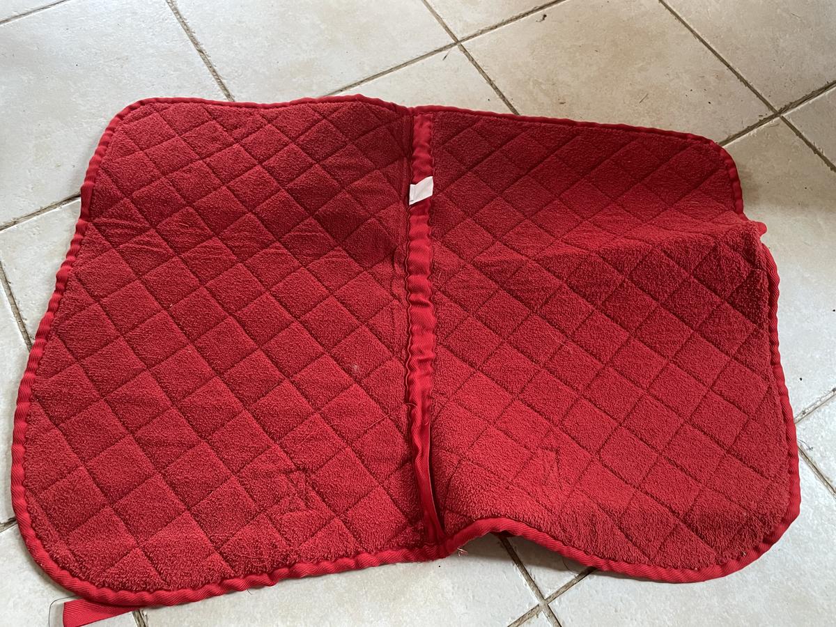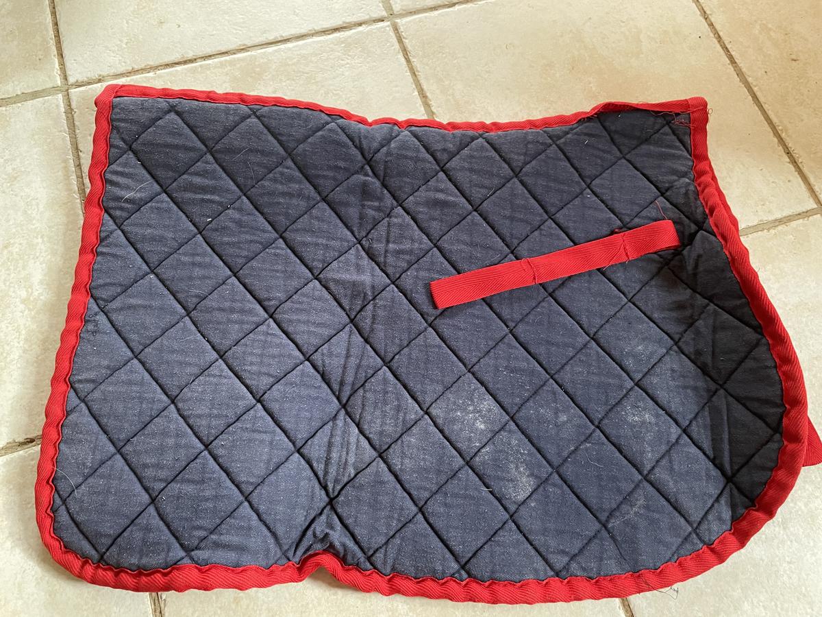 Tapis décathlon bleu marine, bord rouge, ne comporte pas de passages de sangle.