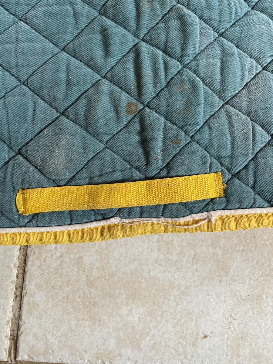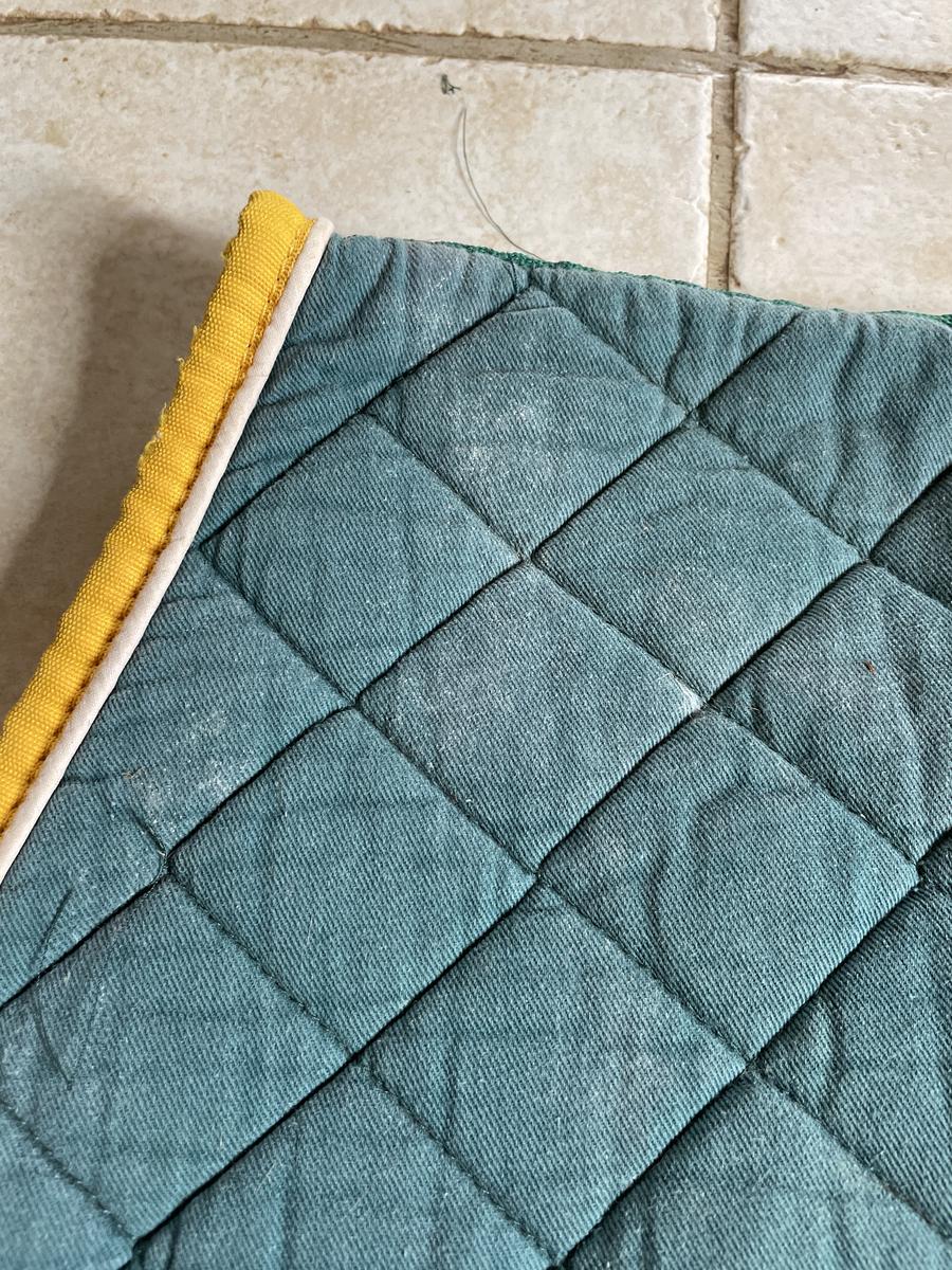 Tapis décathlon vert foncé, liseré blanc, bord et passage de sangle jaune.