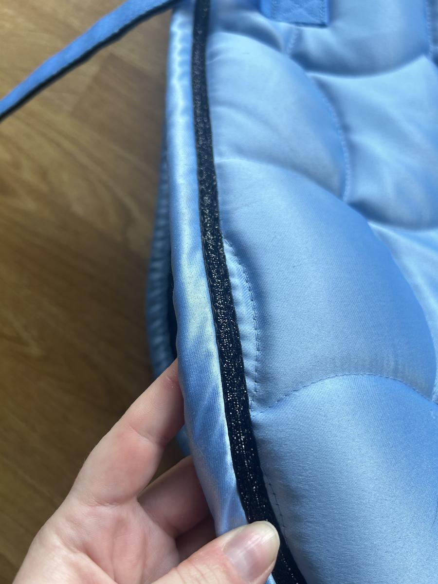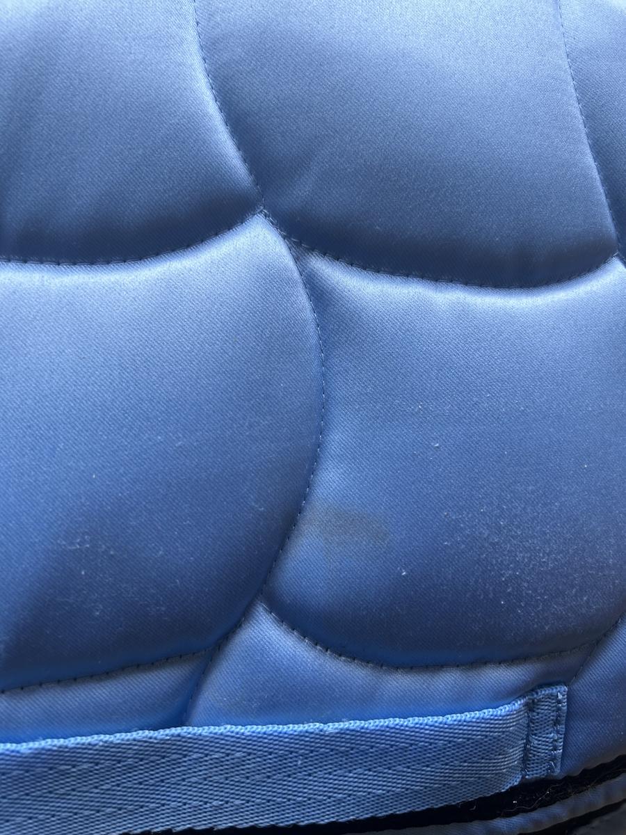 Tapis équitable bleu avec lisere noir paillette. En excellent état juste une petite tache en photo. A été lavé