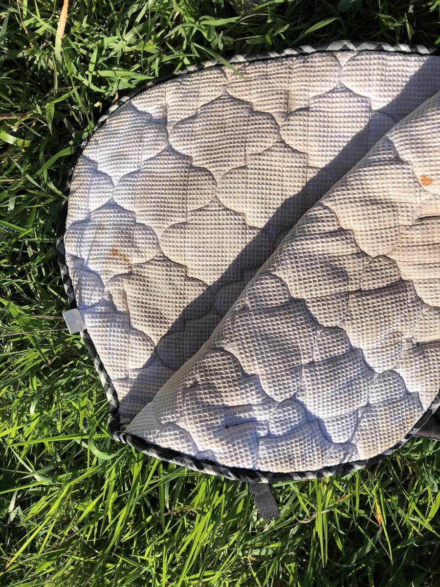 Tapis taille poney (M) noir liseret vichy en très bon état extérieur, intérieur nid d’abeille avec petites taches de rouille