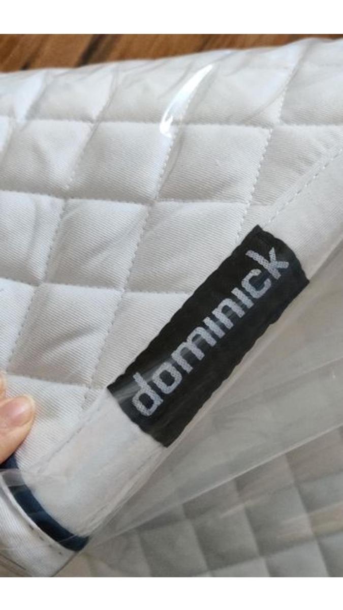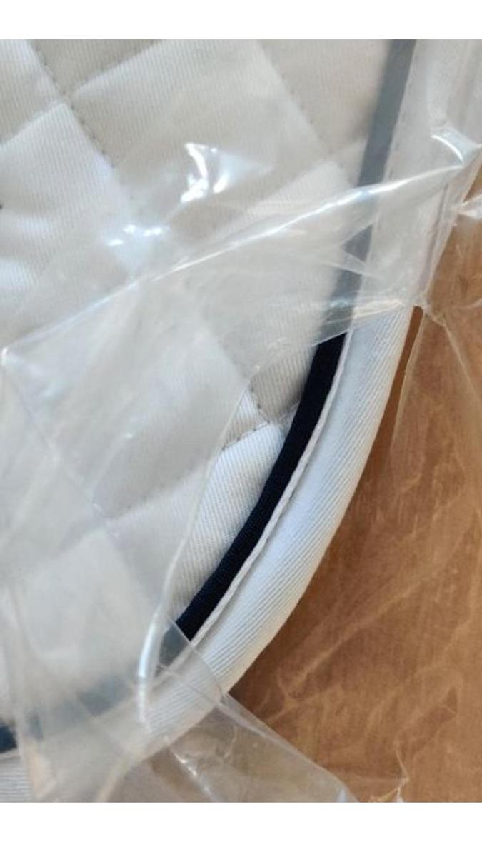 Tapis blanc marque Dominick liseré et broderie bleu marine, taille CSO.