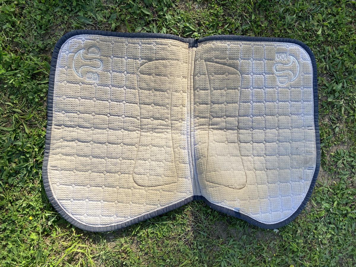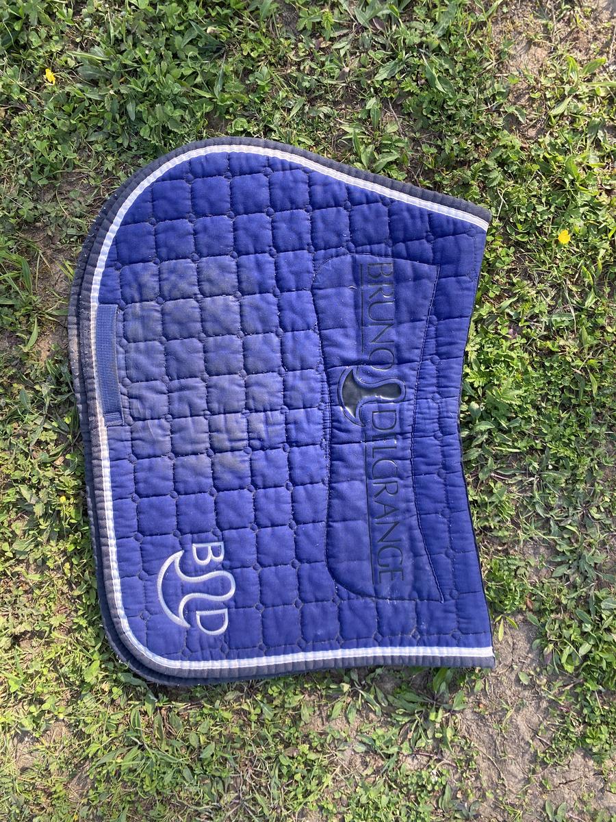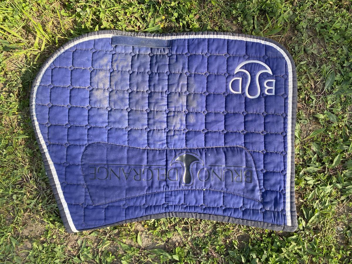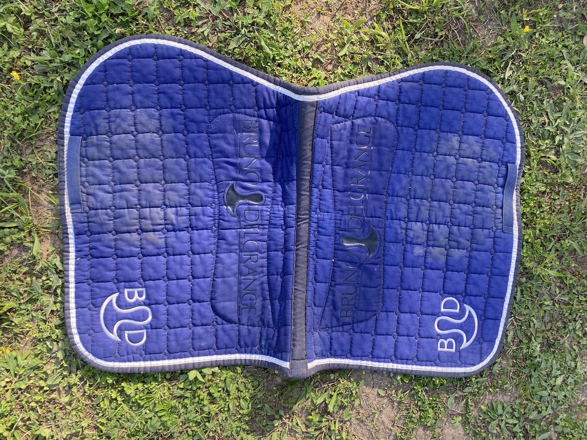 Tapis de selle Bruno Delgrange bleu avec le logo de la marque. Très bon état. Dégarotte parfaitement et reste en place durant toute la durée de la monte.