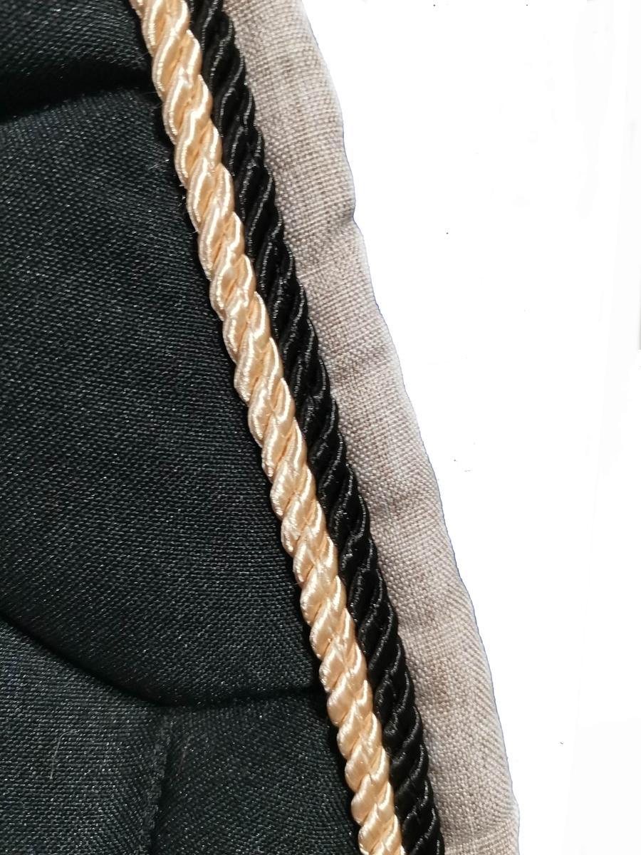 Tapis de selle artisanal créé par la marque Equ'idées en collaboration avec Havane sellier. Coloris noir, cordelettes noire et beige, bordure beige chiné. Il s'accorde avec tout tout est restant original. Logo simili cuir camel. Tapis très bien dégarrotté, comme sait le faire Equ'idées. Neuf.