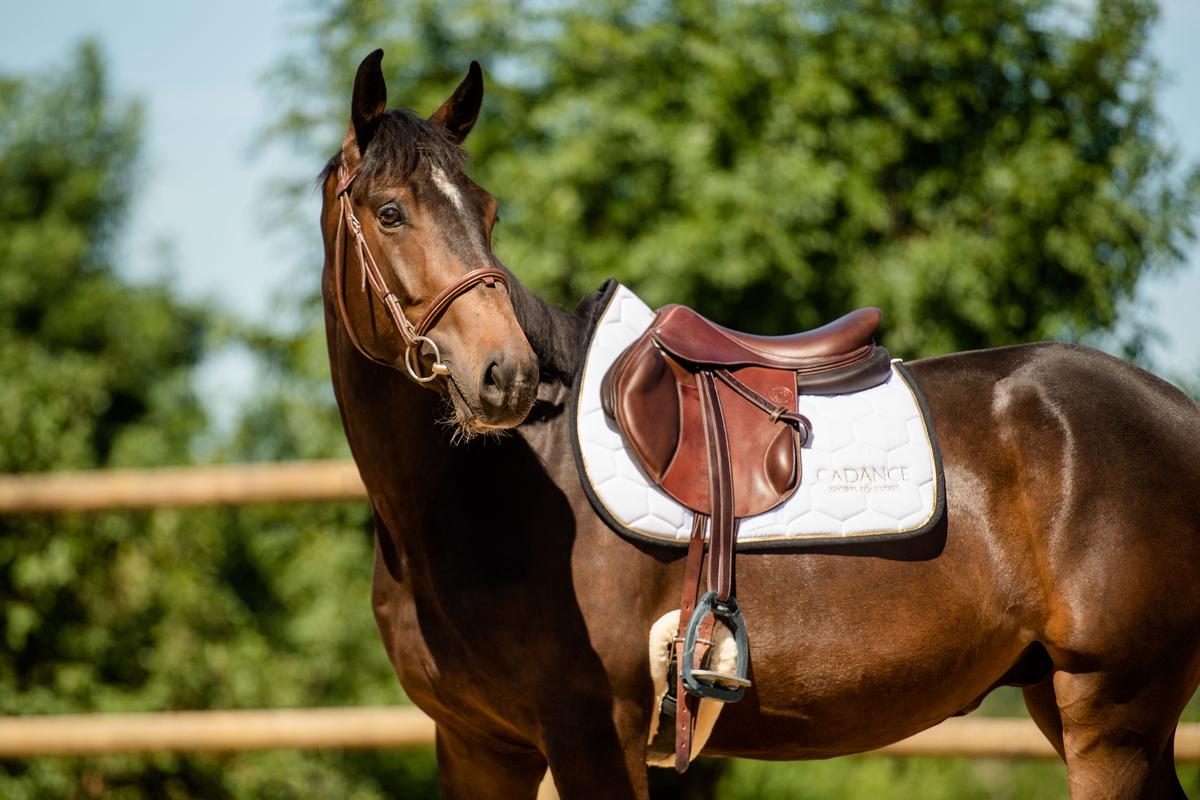 Tapis mixte blanc liseré et broderie doré bordure noire de la marque francaise Cadance Sports Équestres