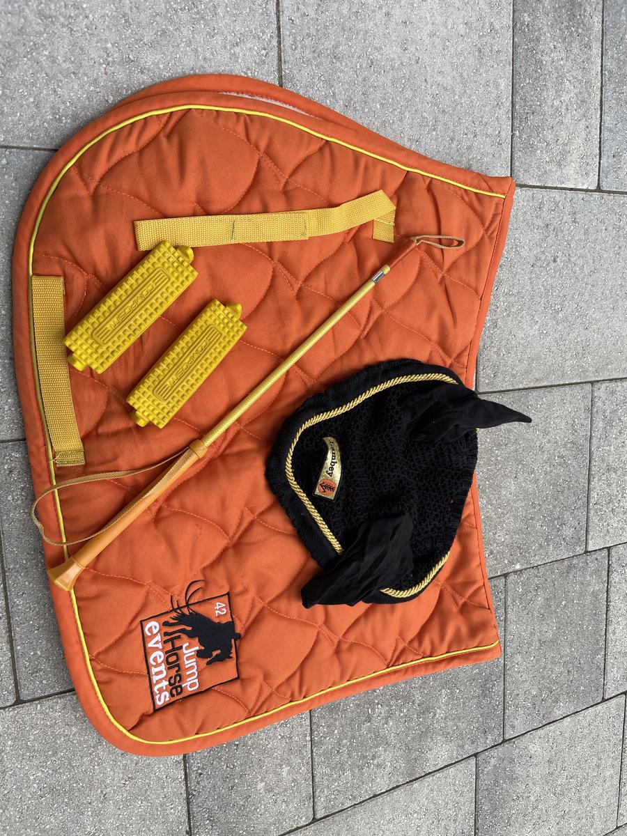 Peut être vendu avec une cravache jaune et/ou un bonnet noir et jaune et/ou des planchers d’étriers prix variable de 20 à 12 euros selon les produits