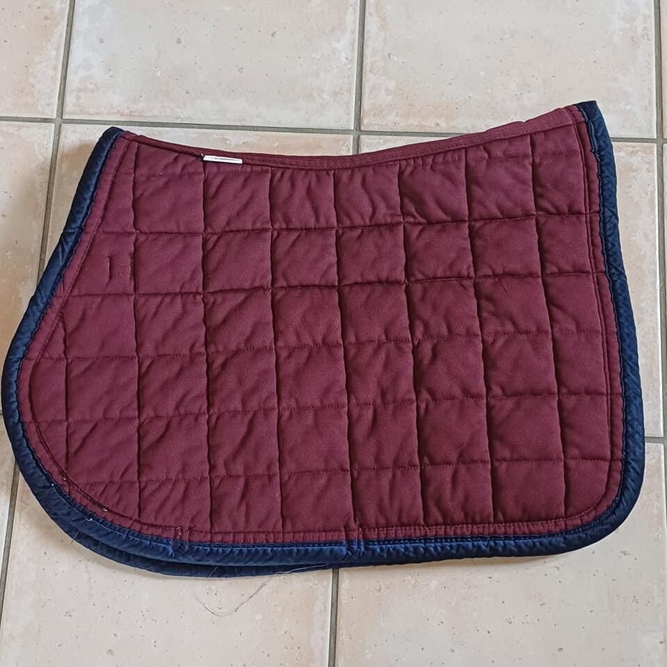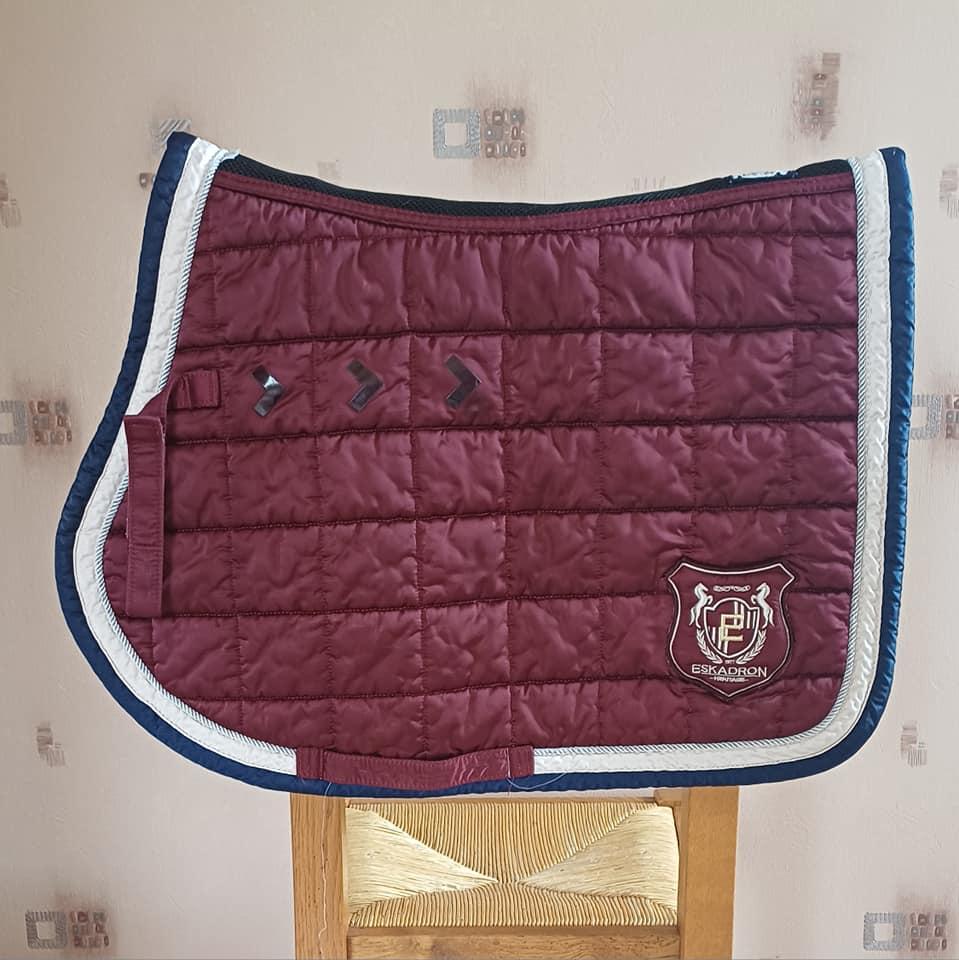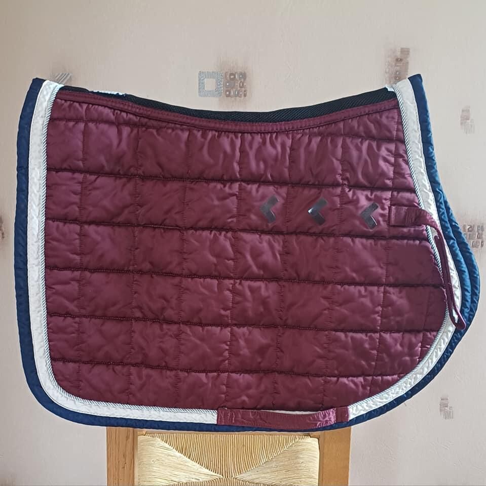 Tapis Eskadron bordeaux effet satiné avec le bord bleu marine, satiné lui aussi et cordelette argentée.