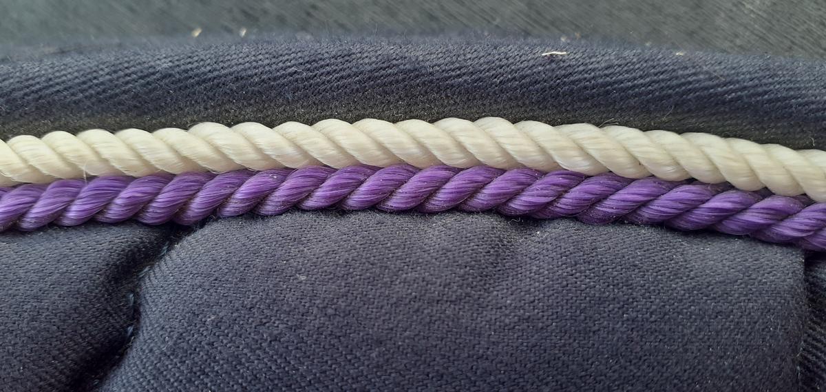 Il est bleu marine avec une cordelette violette et une blanche.