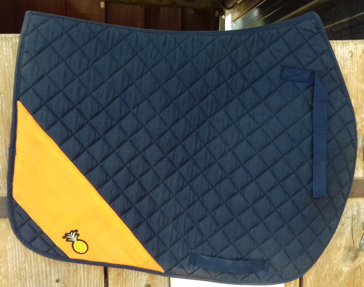 Tapis de selle bleu marine personnalisé avec du tissu orange et des fruits dans les coins. En bon état avec une légère tache.