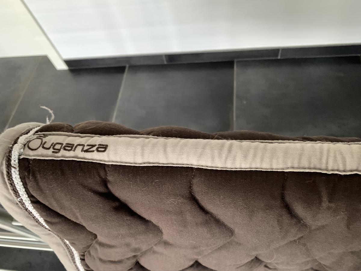 Tapis Fouganza brun mixte. Coton nid d'abeilles, de forme anatomique, matelassage en zig zag, avec un logo brodé sur un côté, avec passant de sangle. Bon état. Possible de négocier le prix
