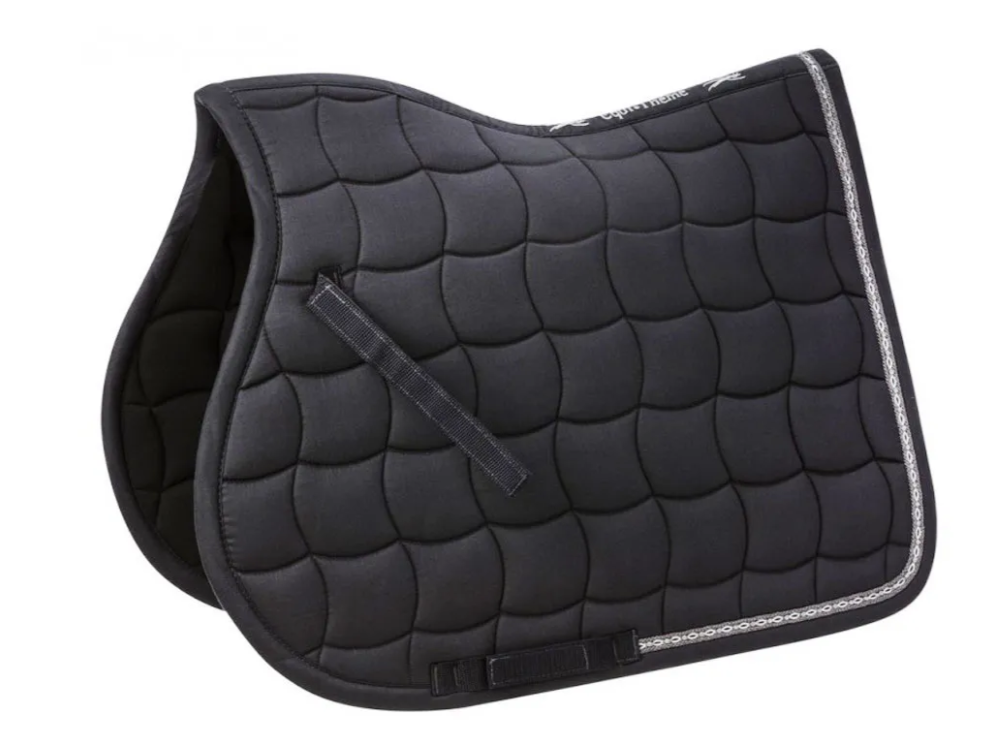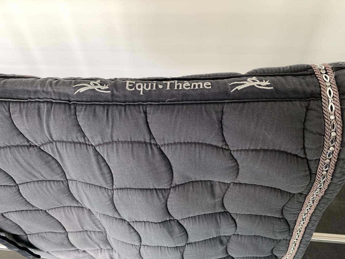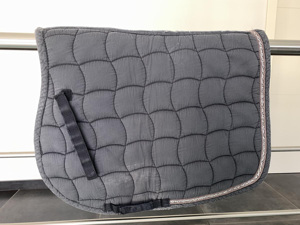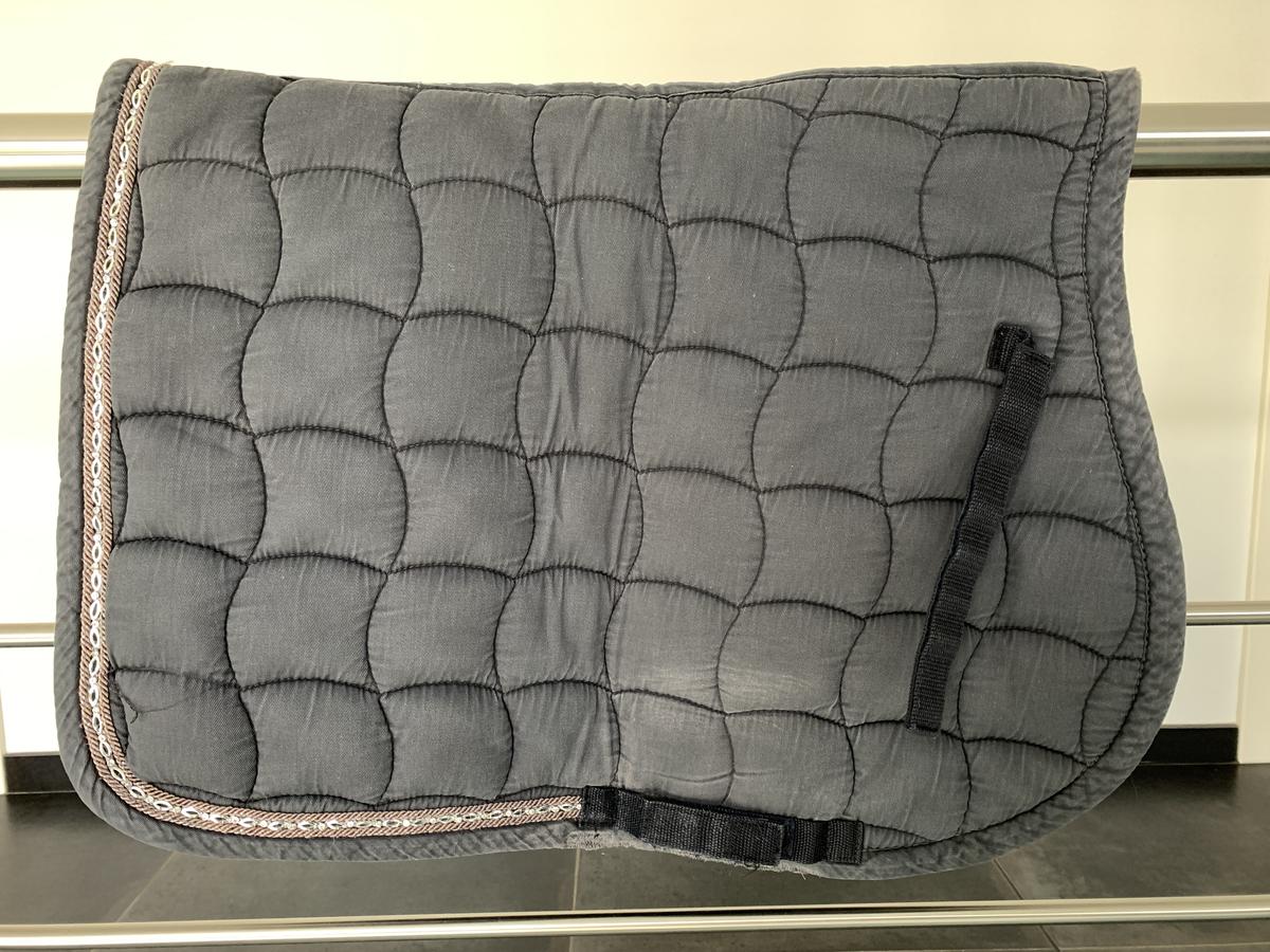 Tapis de selle Equithème Bracelet mixte gris avec piquage ondulé et bordure ton sur ton. Ligne de dos dégarrottée. Décoré d'une chaînette de coloris argenté composée de mailles ovales discrètement rehaussées de strass transparents. Double tresse avec fil de coloris argenté. Pattes d'attache auto-agrippantes et passage de sangle. Doublure absorbante en mesh polyester, 100% coton. Possible de négocier le prix.