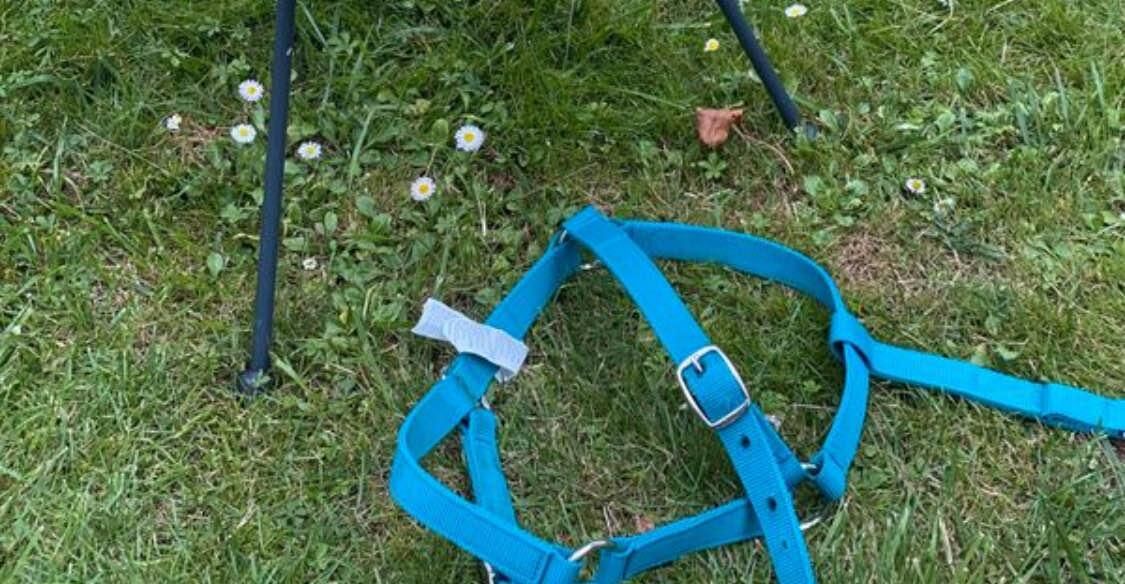 Tapis et licol de la marque Decathlon avec la longe, mais je n’ai pas de photo en très bon état. Jamais utilisé le licol à deux trous en plus car il était trop grand mais n’a jamais été porté.