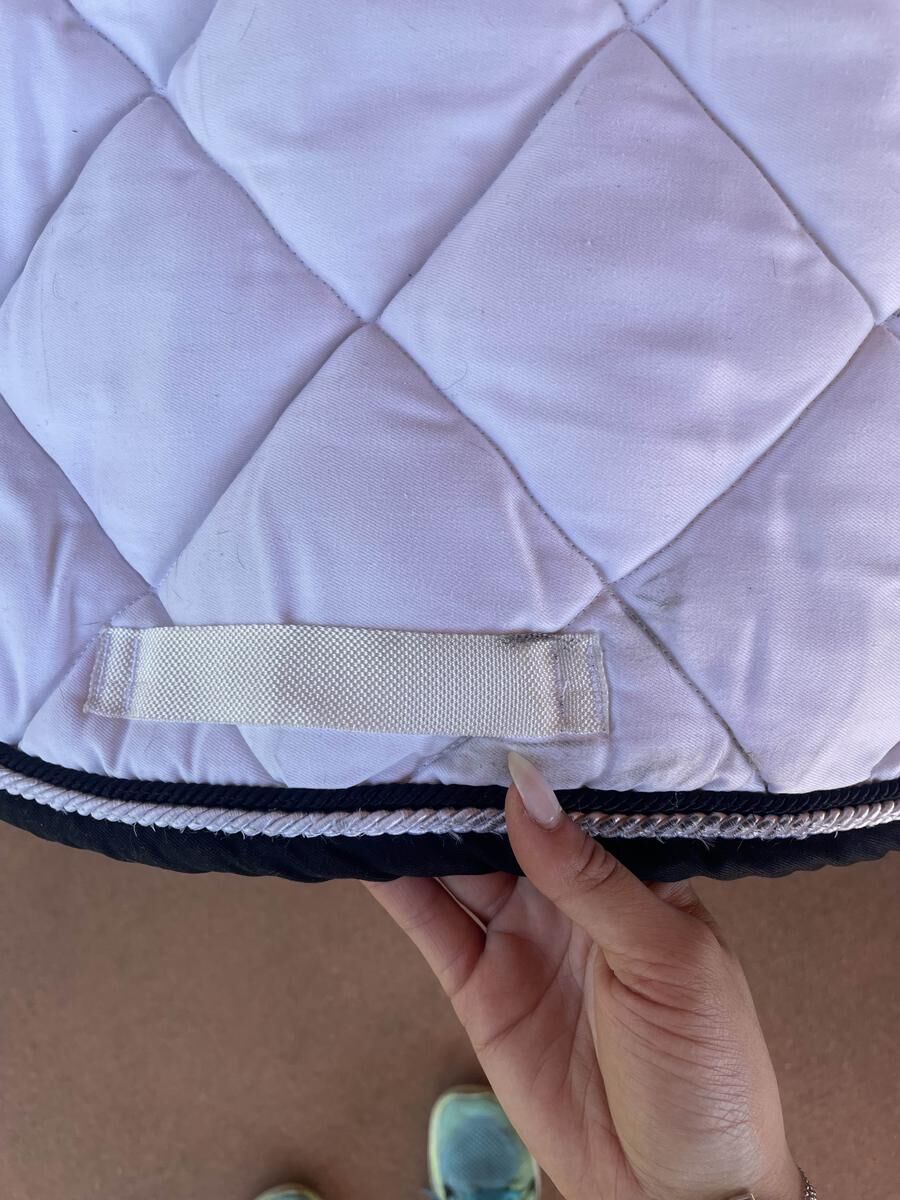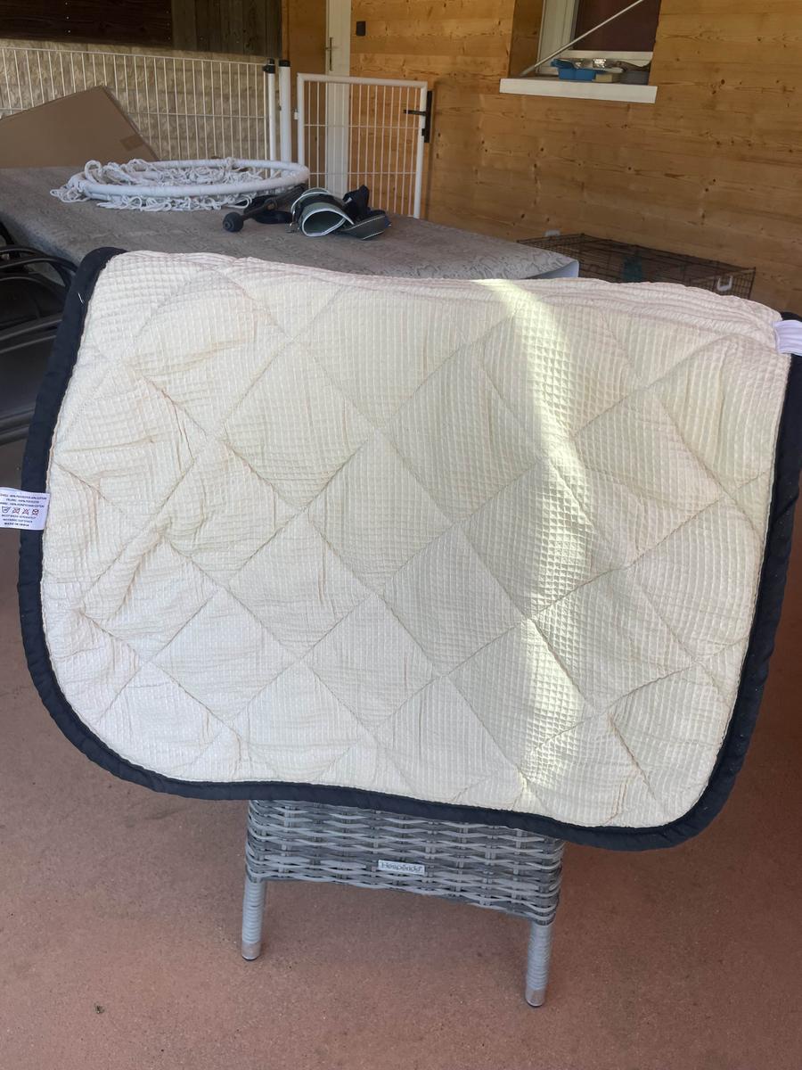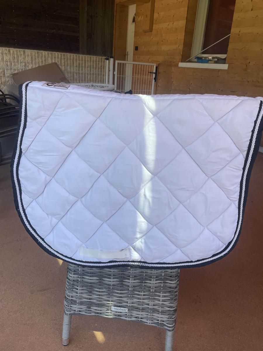 Vends tapis Privilège Équitation Taille cheval Blanc et liseret noir porté une fois quelques marques de cuir au niveau des sanglons