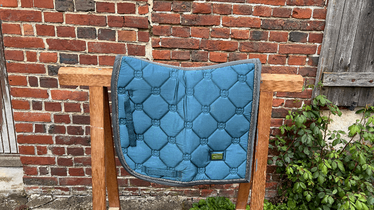 Je vends un tapis de dressage taille cheval de chez Equestrian Stockholm, la première collection avec l'influenceur Matt Harnacke bleu avec les bords gris.