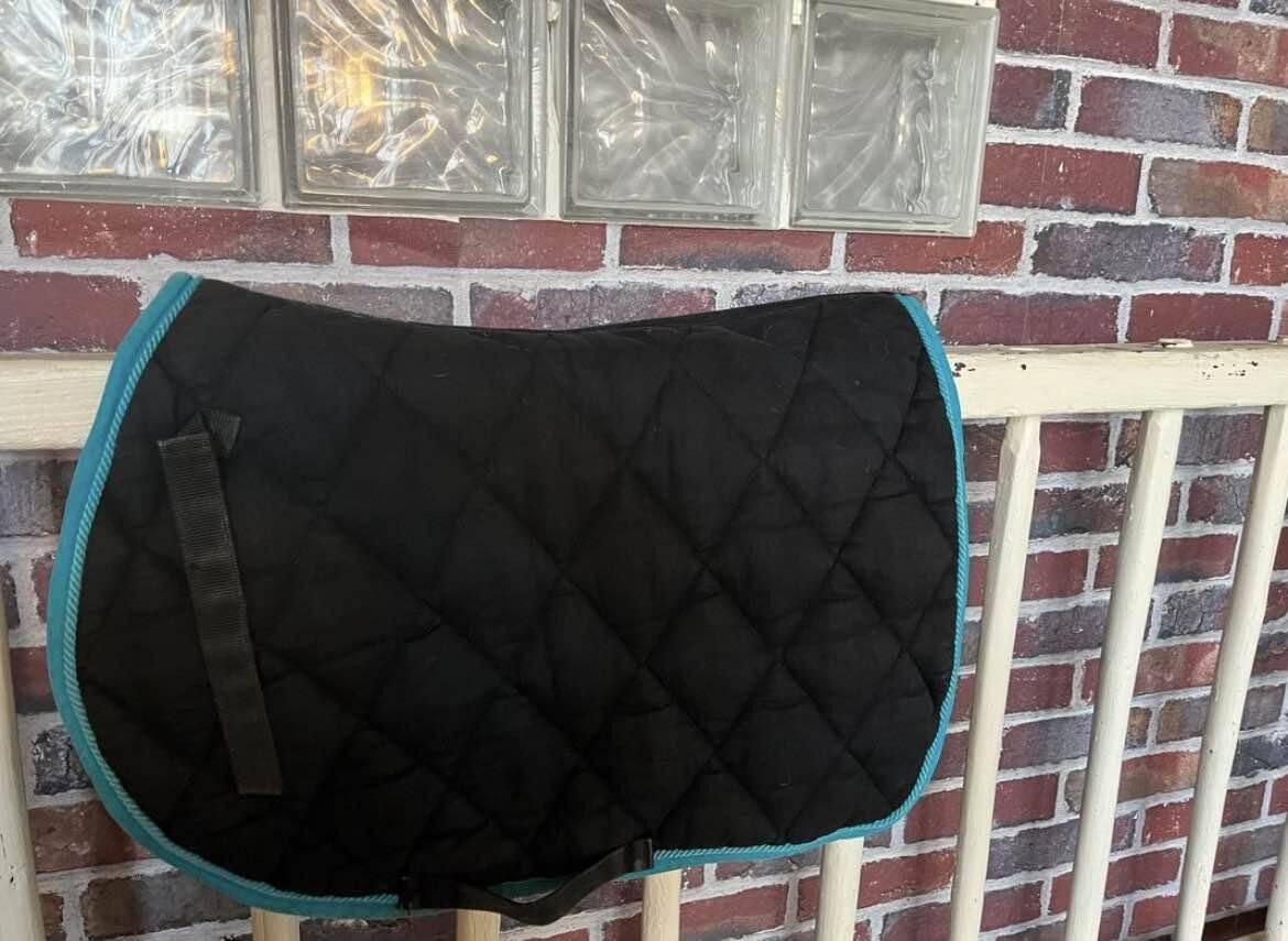 Tapis de selle taille poney de marque equitheme noir avec liseré bleu en très bonne état