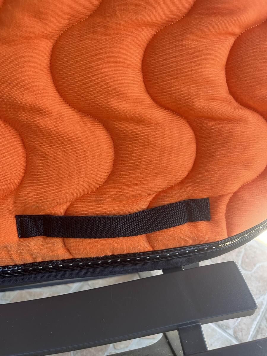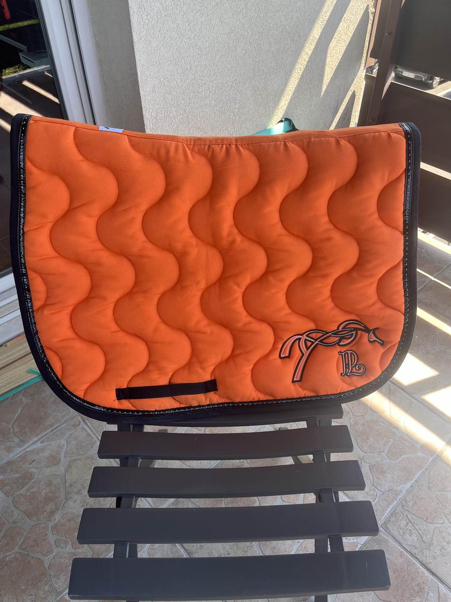 tapis Pénélope orange et noir très bon état mais a quelque traces noires au niveau de la sangle et est légèrement abîmé au niveau de la selle mais ne se voit pas une fois la selle mise ( voir photo)